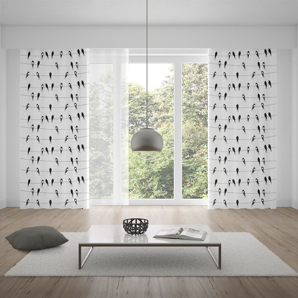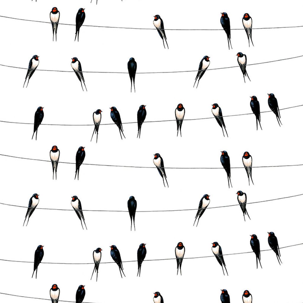 Bomullstyg med offwhite botten och mönster med ladusvalor i svart.