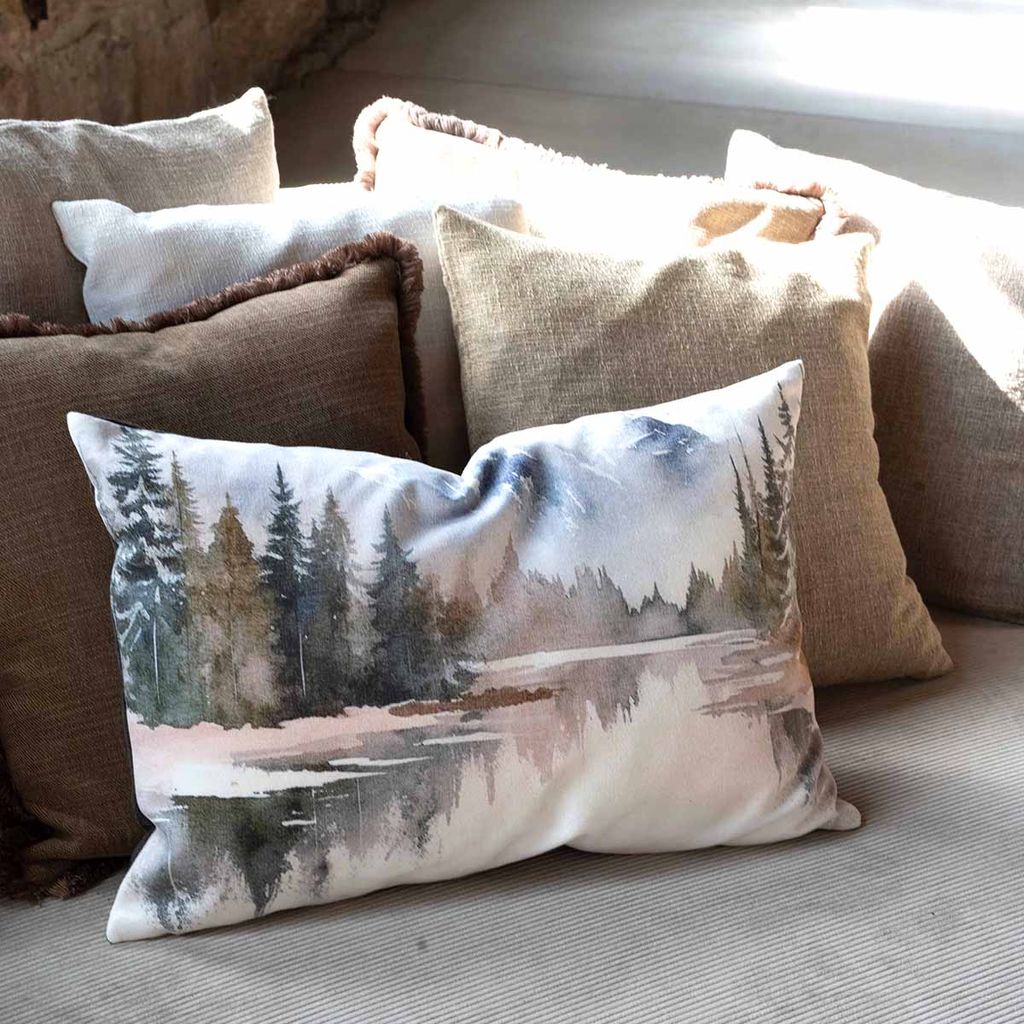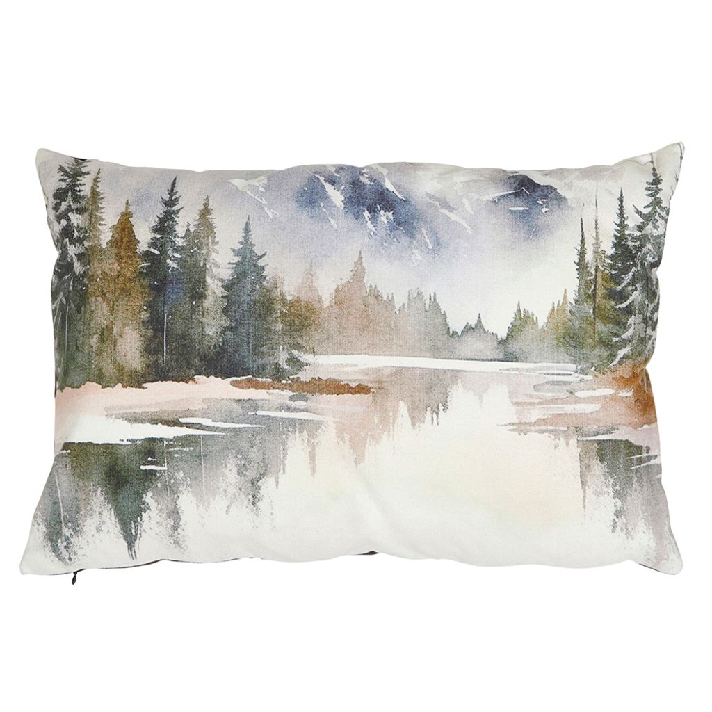 Lake kuddfodral i storlek 40x60 cm är en poetisk hyllning till den nordiska vintern. Med ett målat motiv av snötäckta fjäll, skogar och en spegelblank sjö förmedlar kudden stillhet och naturlig skönhet – som att fånga ett fruset ögonblick i textil form. Färgpaletten går i dämpade nyanser av blått, grått, vitt och brunt som harmoniserar med både moderna och klassiska inredningsmiljöer.
