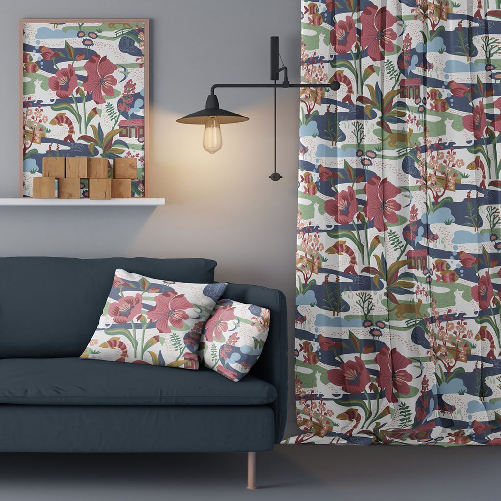 Ge ditt hem en sagolik känsla med Landet Bubblar blå-rosa gardiner. Detta unika mönster för tankarna till en idyllisk svensk sommar med sina vackra blommor, porlande vattendrag och charmiga röda stugor. Fiskarna som leker i vattnet och de graciösa blommorna skapar ett levande och konstnärligt uttryck, perfekt för att tillföra både färg och personlighet till ditt rum. De mjuka nyanserna av blått, rosa och grönt ger gardinerna ett harmoniskt intryck och passar utmärkt i både klassiska och moderna inredningar.