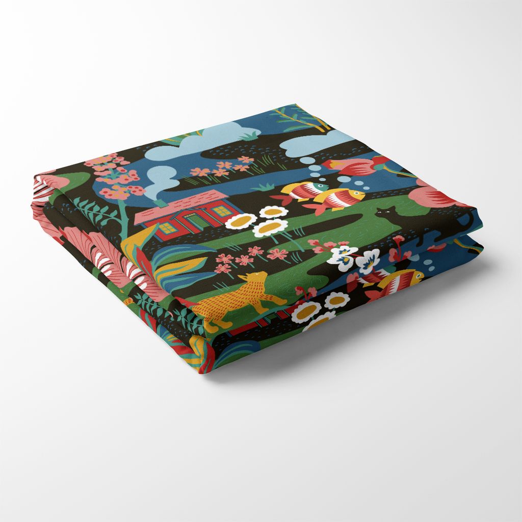 Landet Bubblar svart-multi bordsduk är en färgsprakande och fantasifull textil som skapar en livfull atmosfär i ditt hem. Det detaljerade mönstret av natur och djurliv på en mörk botten ger en djup och inbjudande känsla till ditt dukade bord. Duken finns i 4 olika storlekar.