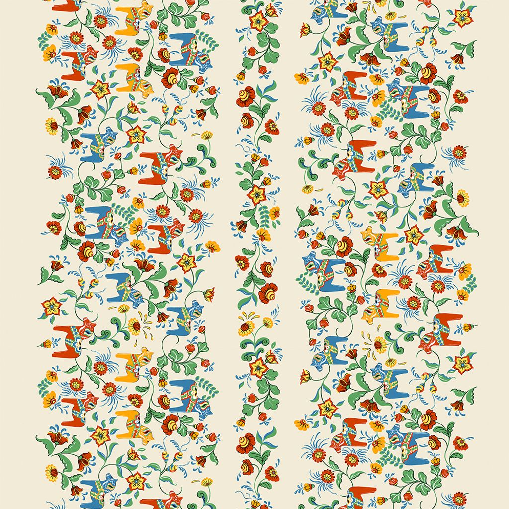 Tyget Leksand bård beige med färgglada dalahästar och kurbits, gör sig bra till gardiner, kuddar, duk, väskor m.m.