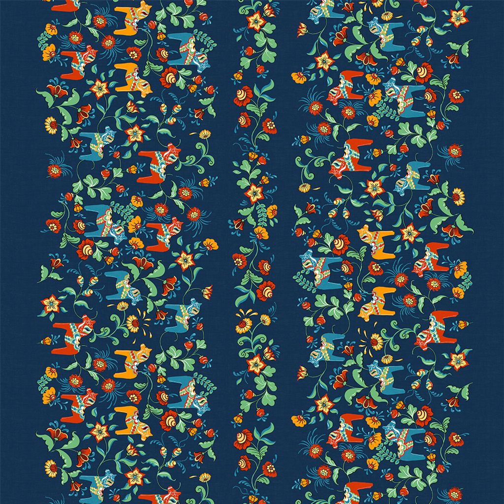 Beskrivning av Leksand bård blå tyg med traditionellt dalahästtryck