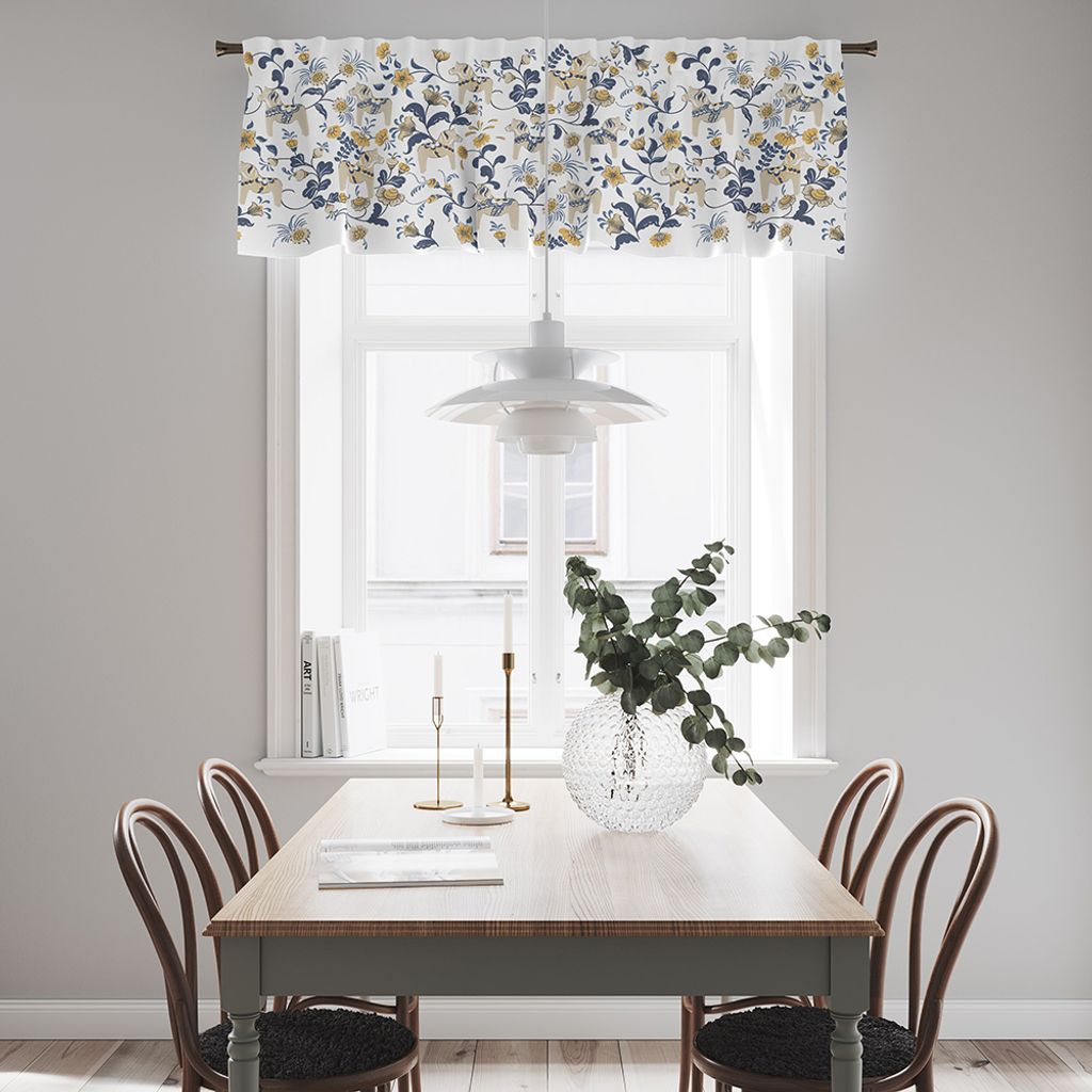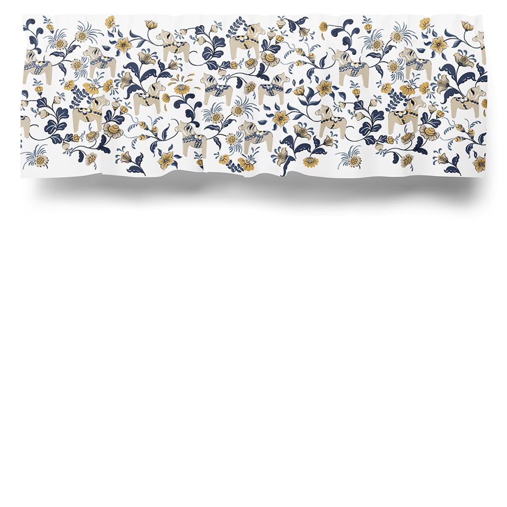 Gardinkappa på metervara med blå, beige och gula dalahästar och kurbits på vit botten. Kappan levereras ofållad i kanterna.