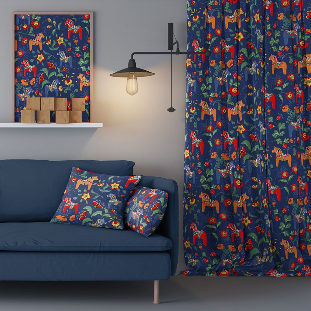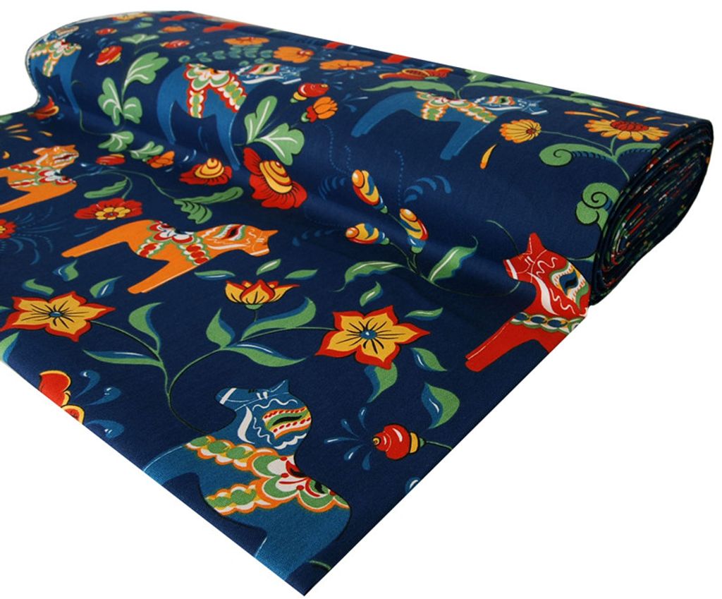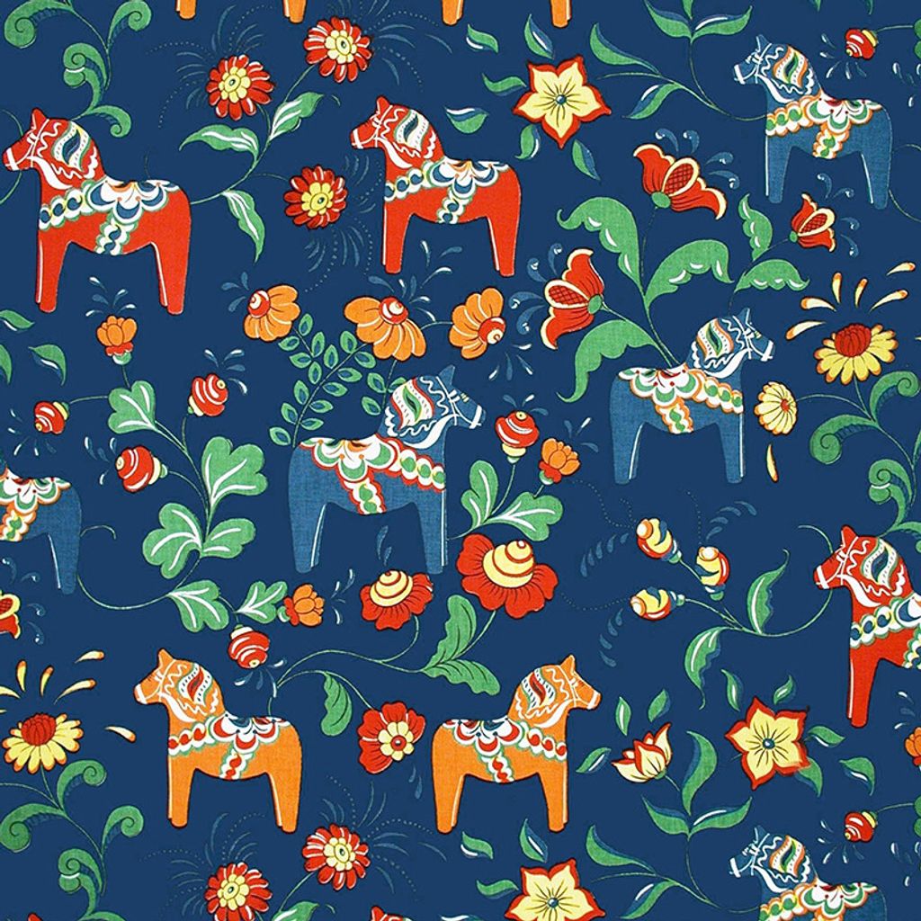 Dalahäst tyg med marin blå botten & olikfärgade mönster.