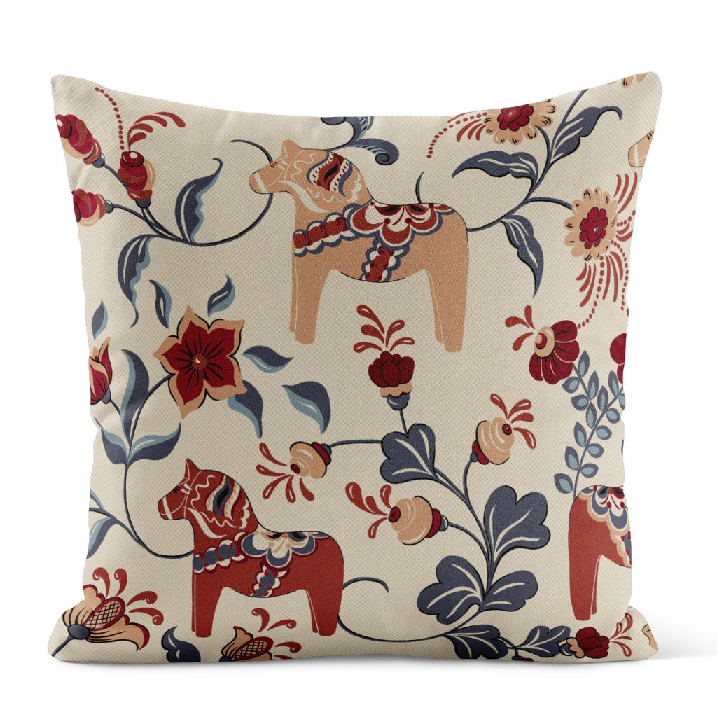 Motivet kombinerar traditionella former med en stilren färgpalett som gör kuddfodralet både tidlöst och lätt att placera i olika miljöer. De detaljrika dalahästarna och de slingrande blomrankorna skapar ett levande mönster som blir en vacker blickpunkt i rummet.