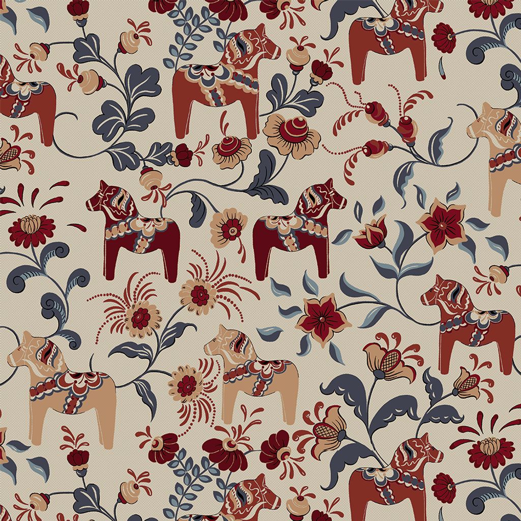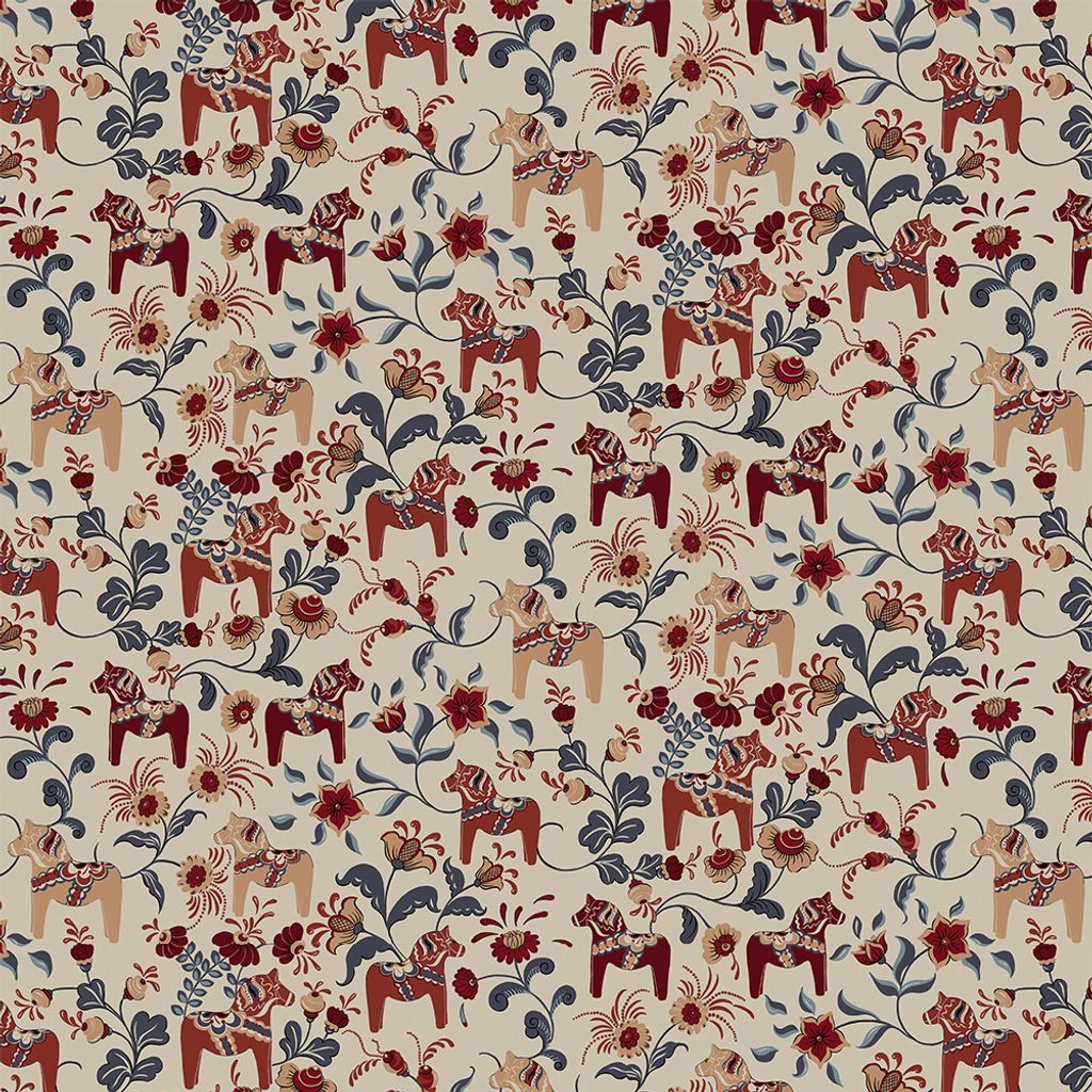 Leksand culla röd är ett mönstrat tyg som hämtar inspiration från svensk folktradition. De återkommande dalahästarna kombineras med blommor och blad i en harmonisk färgskala av djuprött, dämpat blått och varma naturtoner. Den linnefärgade botten ger mönstret lugn och gör att färgerna framträder tydligt utan att upplevas för starka.