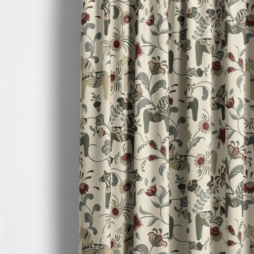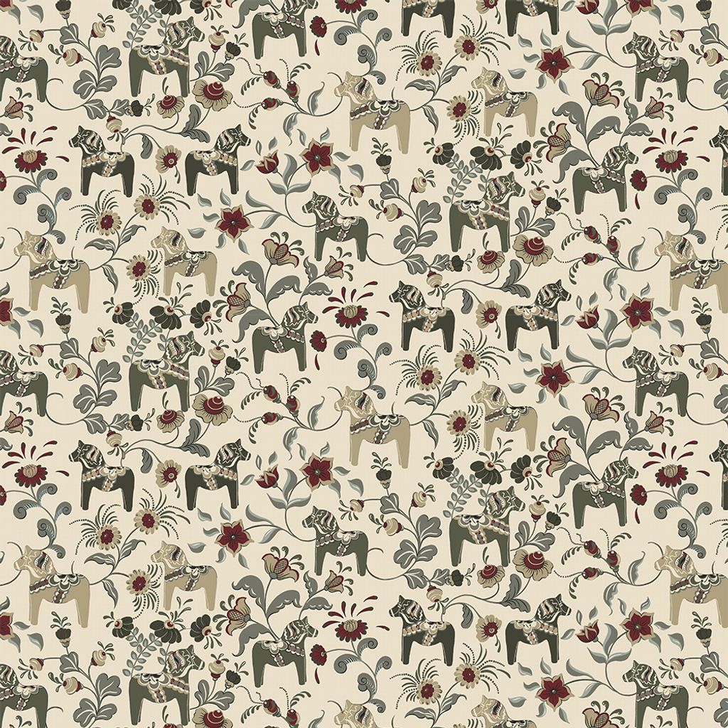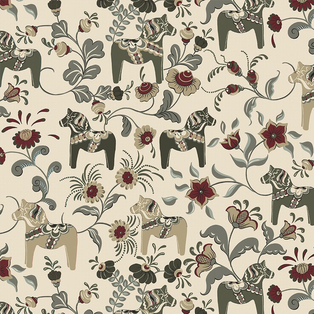 Beige bomullstyg med dalahäst -mönster i jordnära färger. Design Carola Bengtsson-Malmström för Arvidssons Textil.