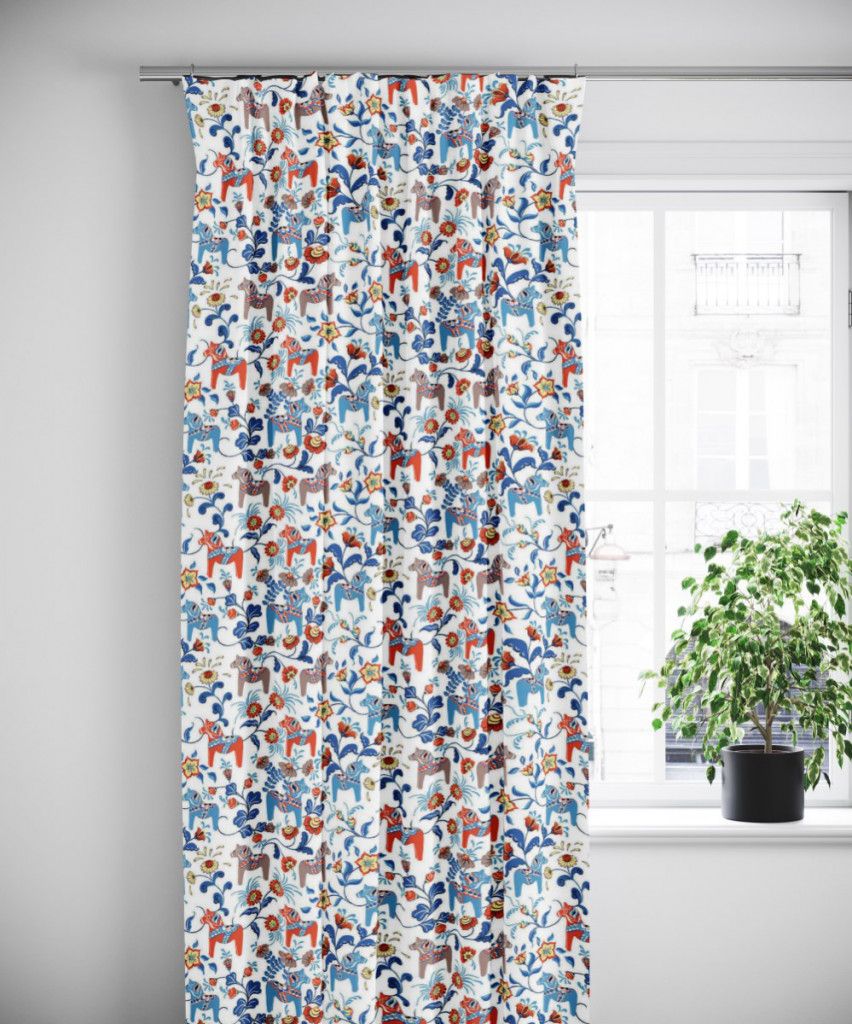 Gardintyg med vit botten och dalahästar i bla. dalablå.