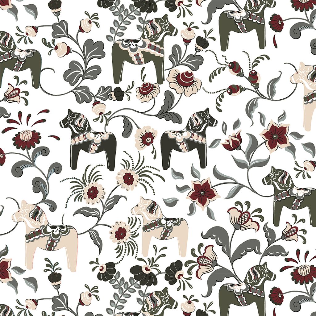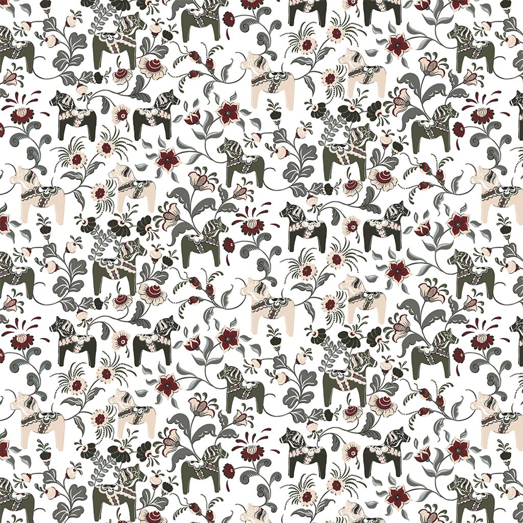Dalahäst tyg med offwhite botten och mönster i grönt, dalaröd och beige