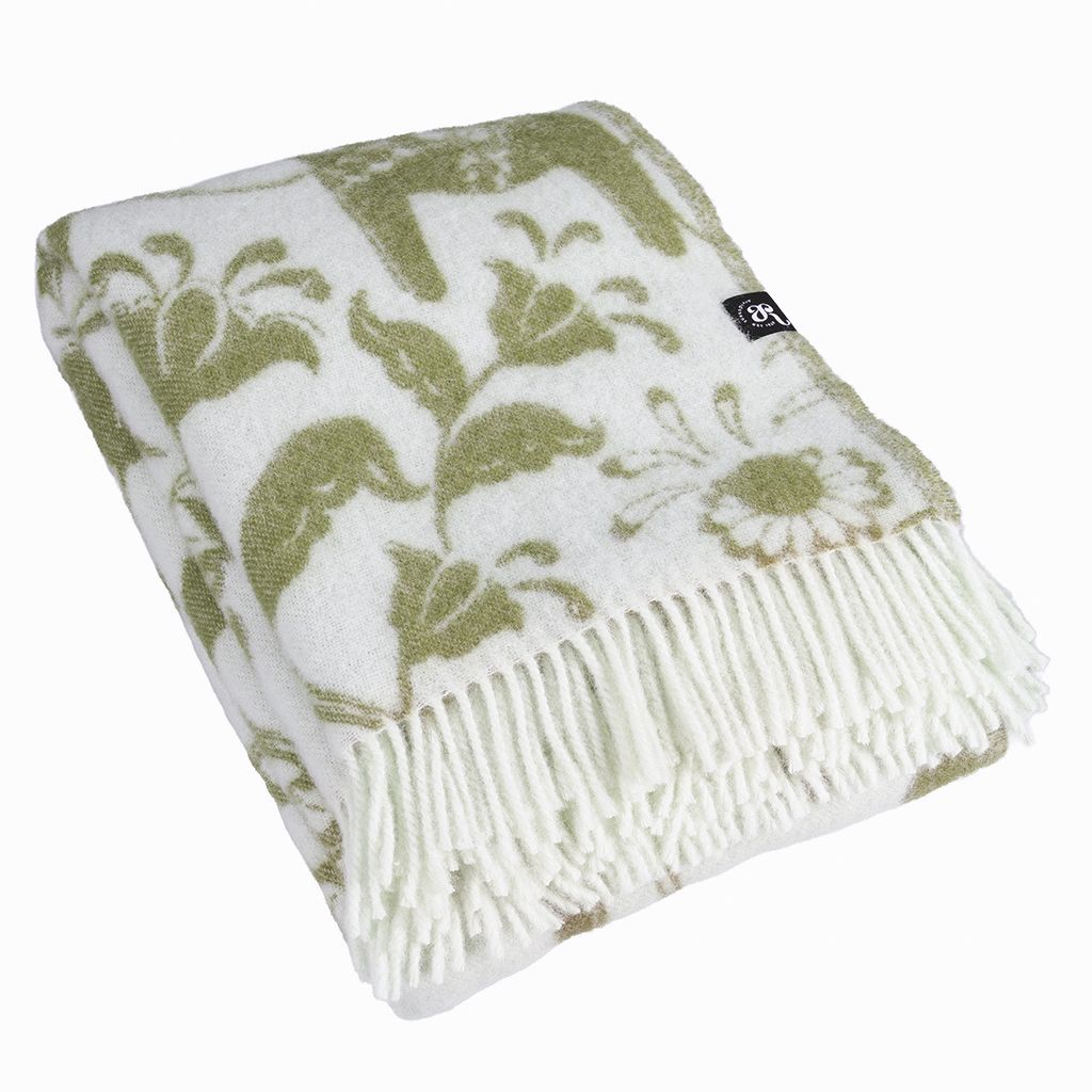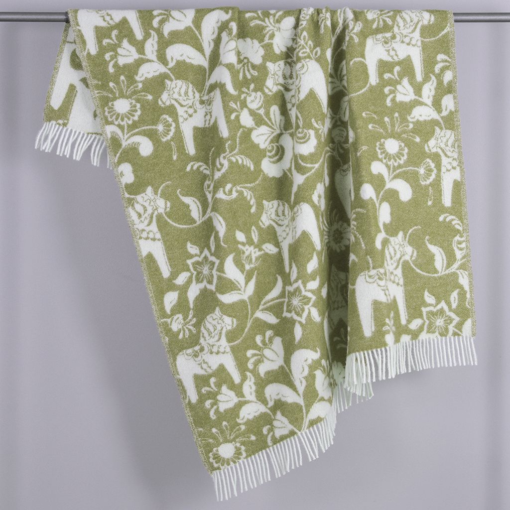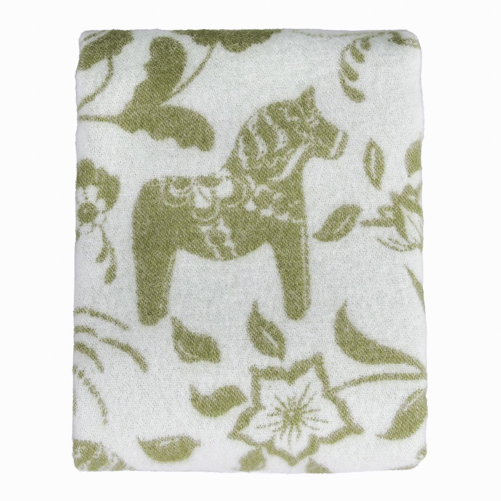 Leksand grön ullpläd 130x170 cm – dalahästar i 100% ull
