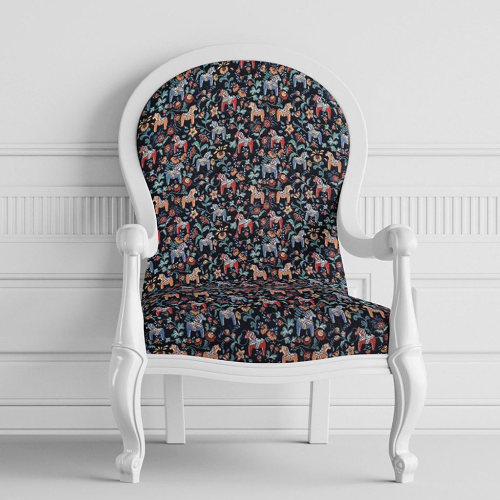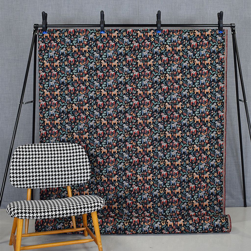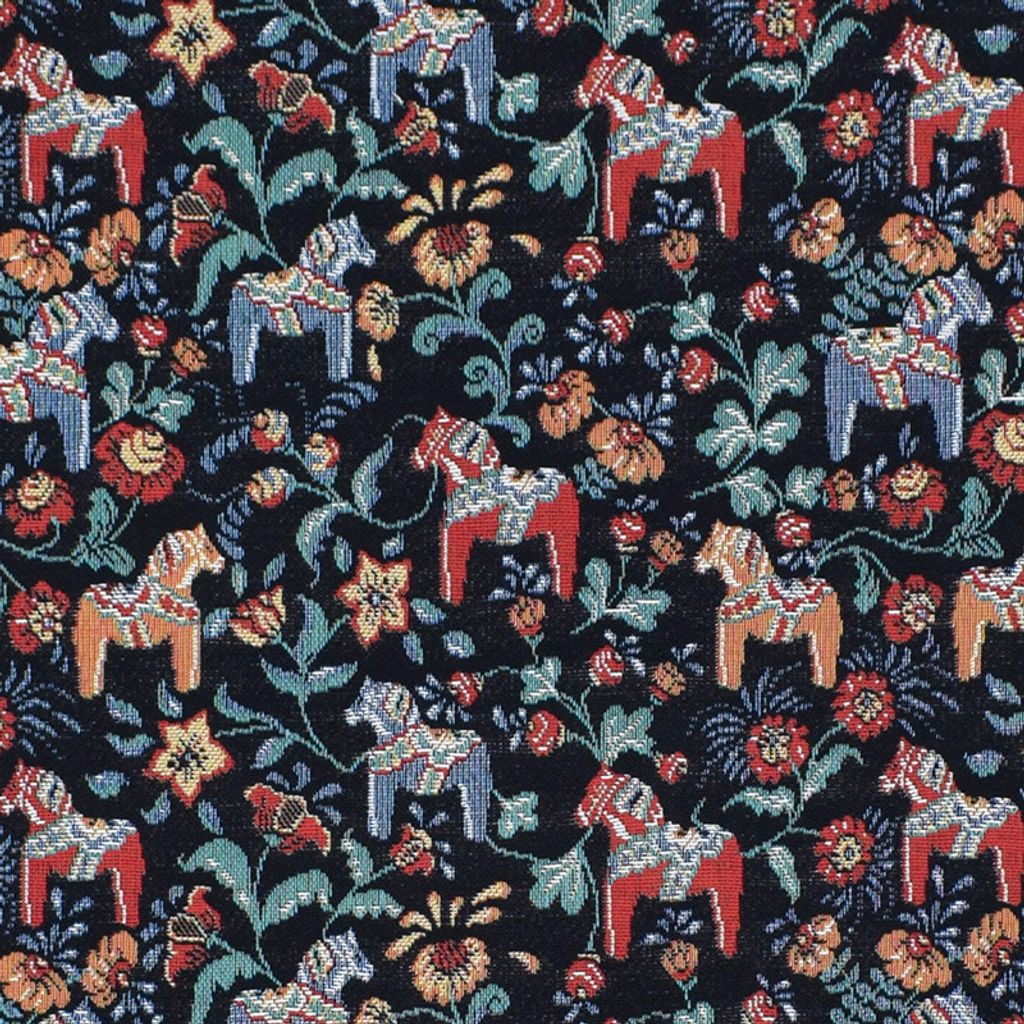 Ett gobeläng möbeltyg med svart botten och dalahästar.