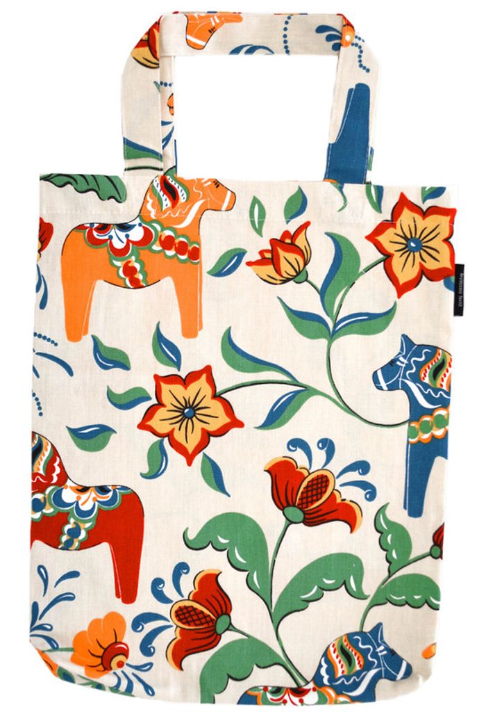 Beskrivning av Leksand natur tygkasse med traditionellt dalahästmönster