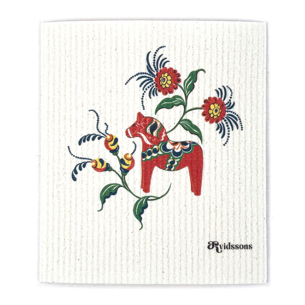 Disktrasa med dalahäst och kurbits-motiv. Tillverkad av 100% biologiskt nedbrytbart material. 70% cellulosa från FSC-märkt skog och 30% bomull.