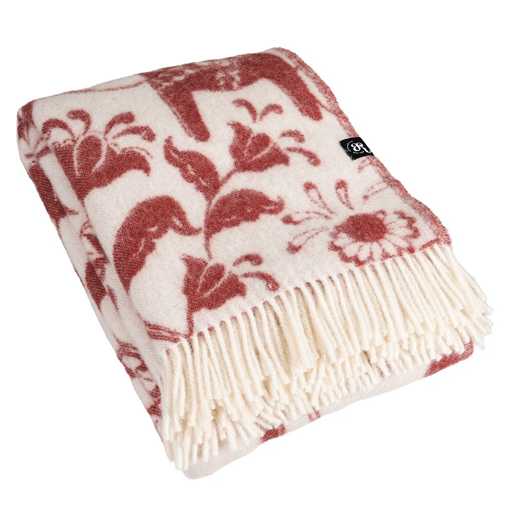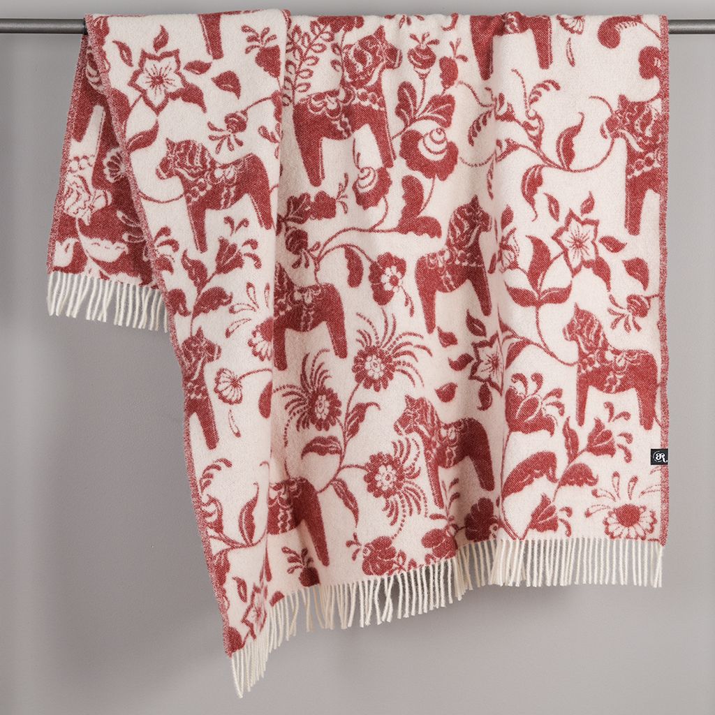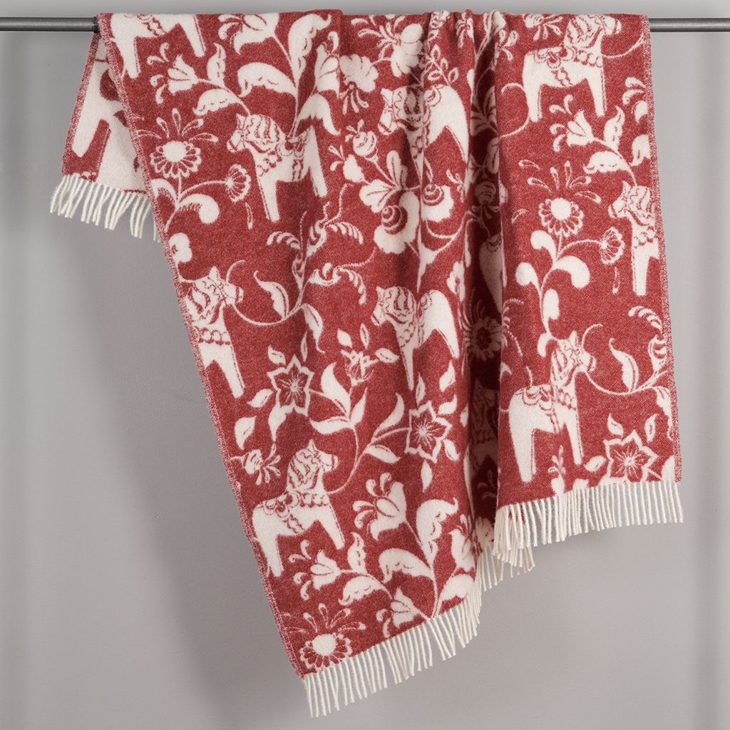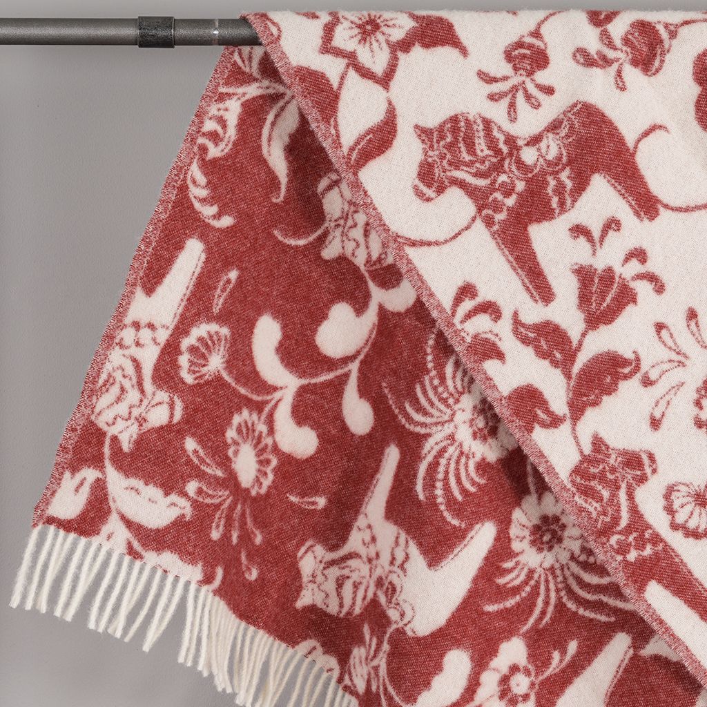 Leksand röd ullpläd 130x170 cm – dalahästar i 100% ull