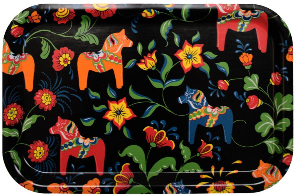 Leksand svart bricka med traditionellt dalahästmönster