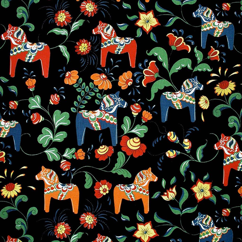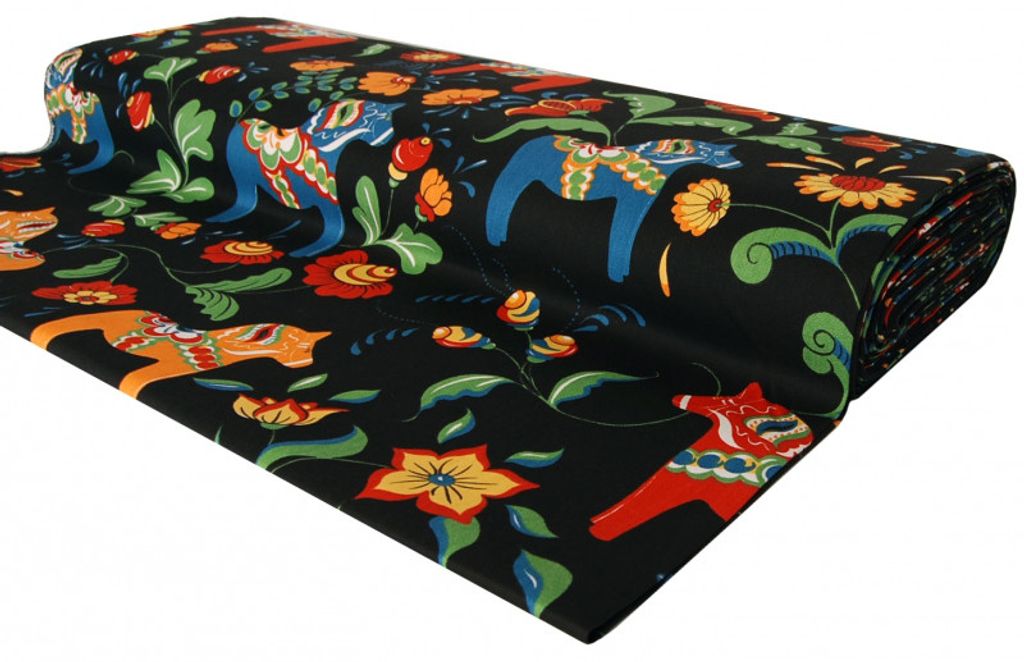 Beskrivning av Leksand svart tyg med traditionellt dalahästtryck