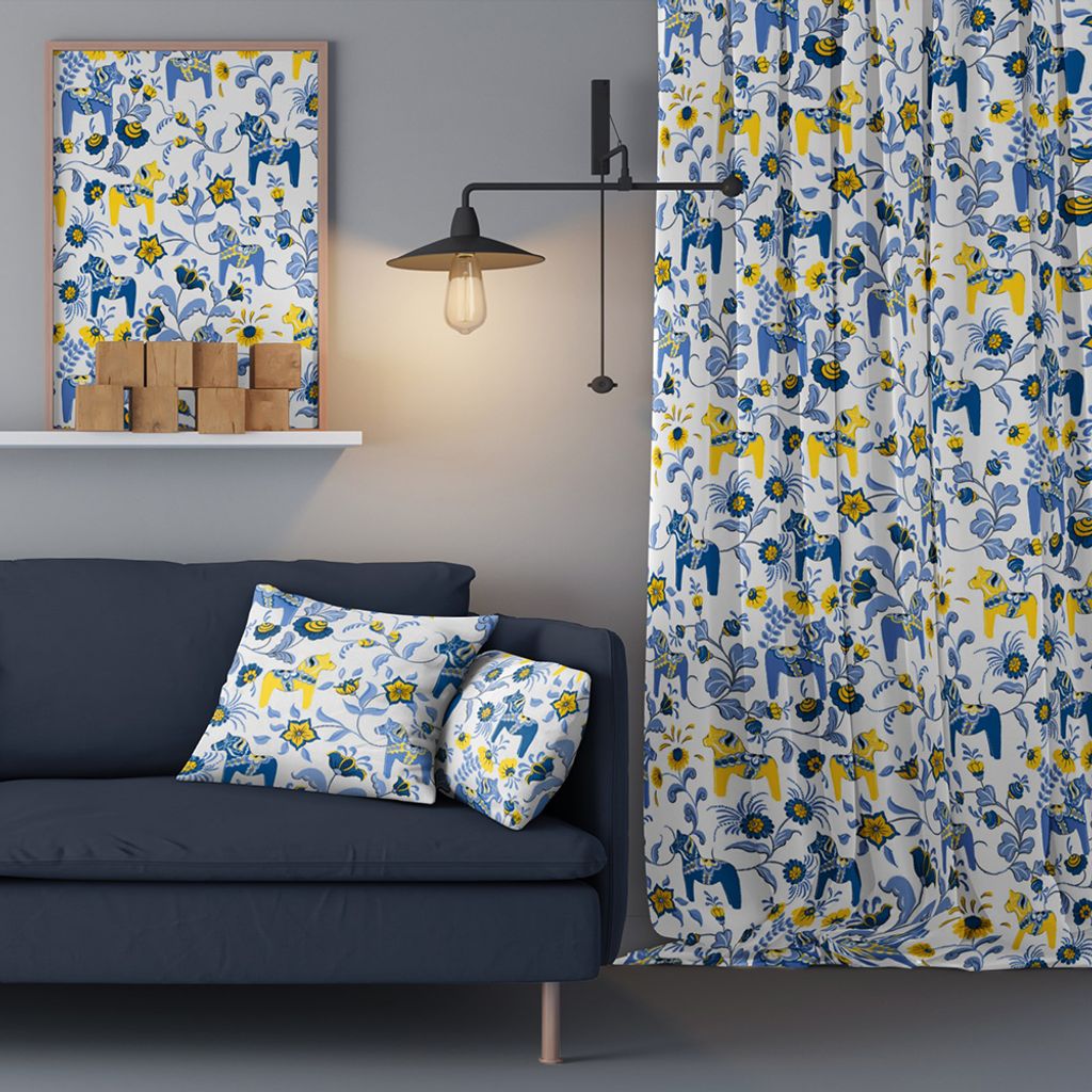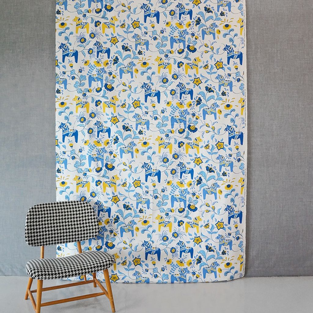 Beskrivning av Leksand Sverige tyg med traditionellt dalahästtryck