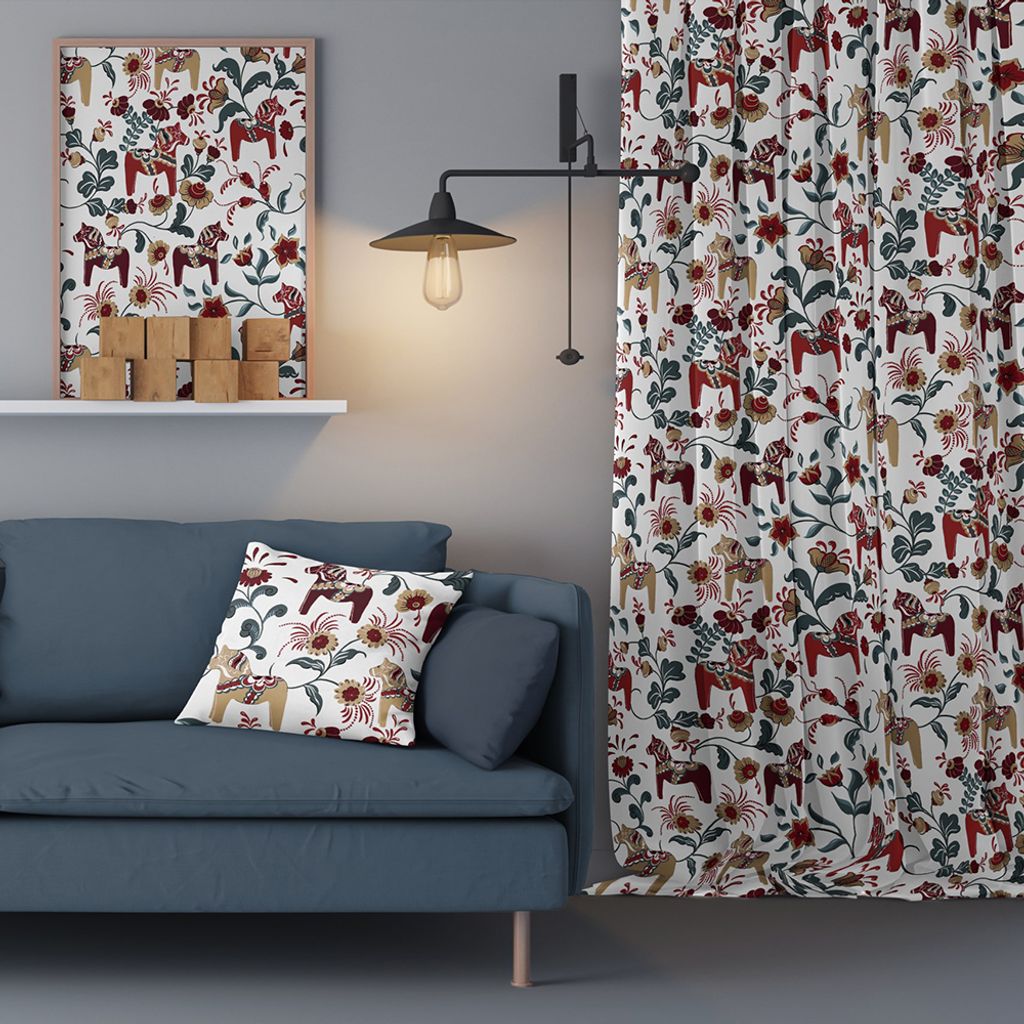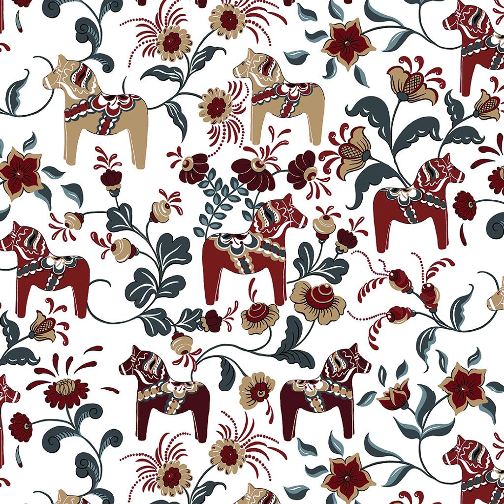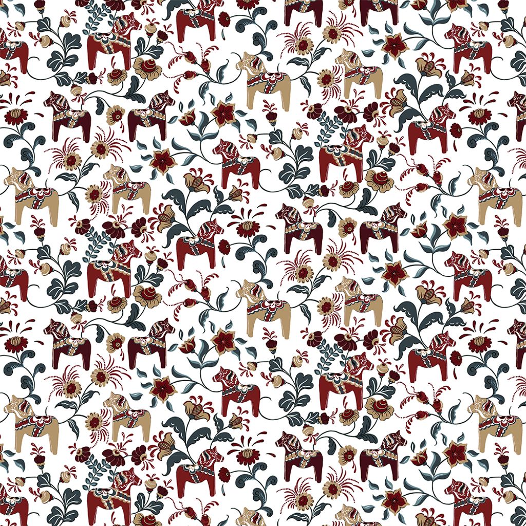 Ett tyg med klassiska dalahästar med stilfulla kurbits i vinrött, beige, petrol och turkost. Mönstret är tryckt på Arvidssons klassiska bomullsvara. Passar lika bra i hemmet som på kontoret. Bild 1 visar halva tygets bredd. Bild nr. 2 visar mönstret på hela tygets bredd. Tillverkat i Spanien