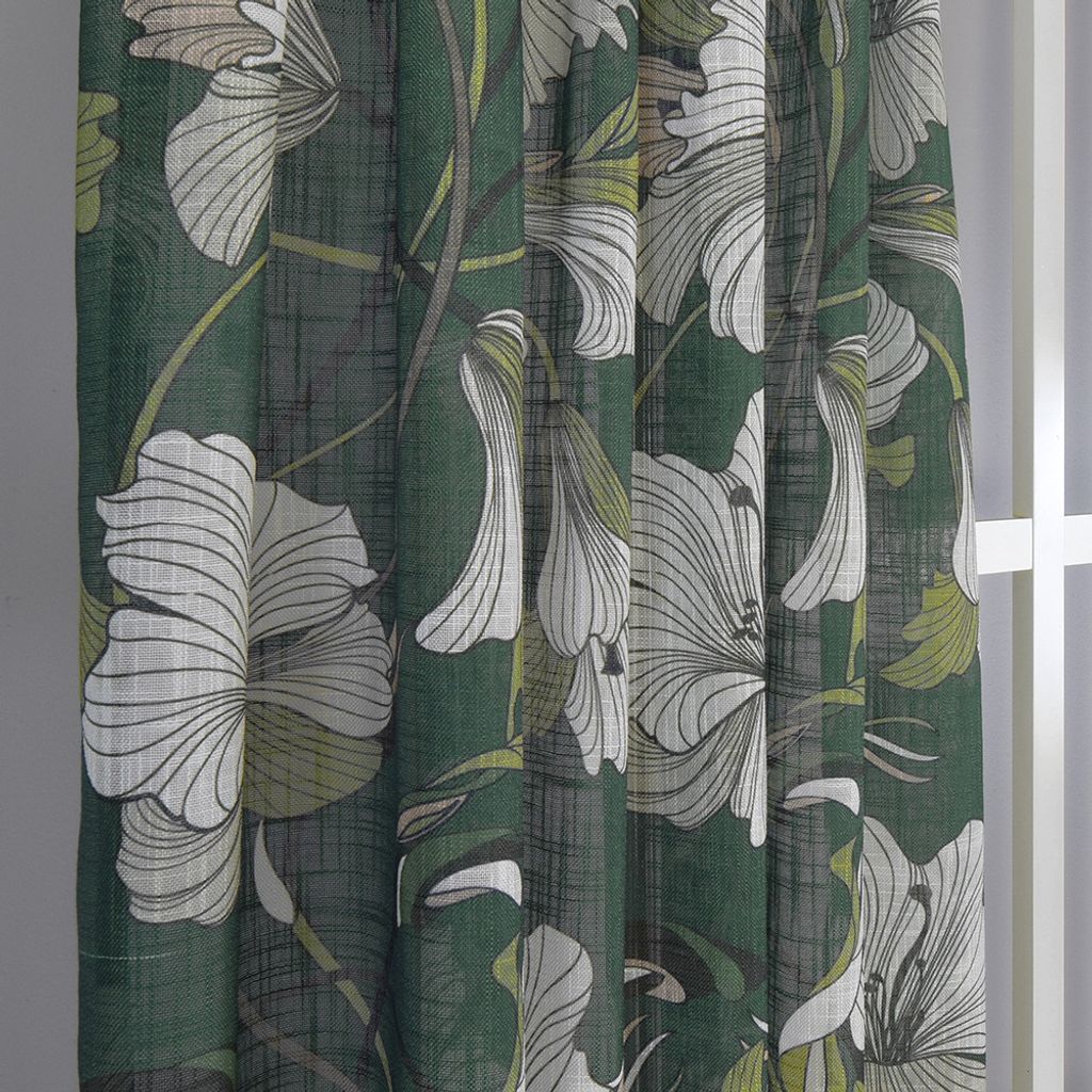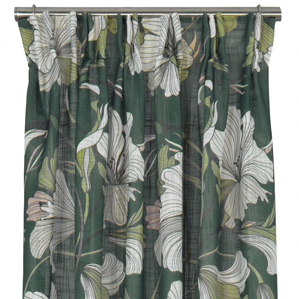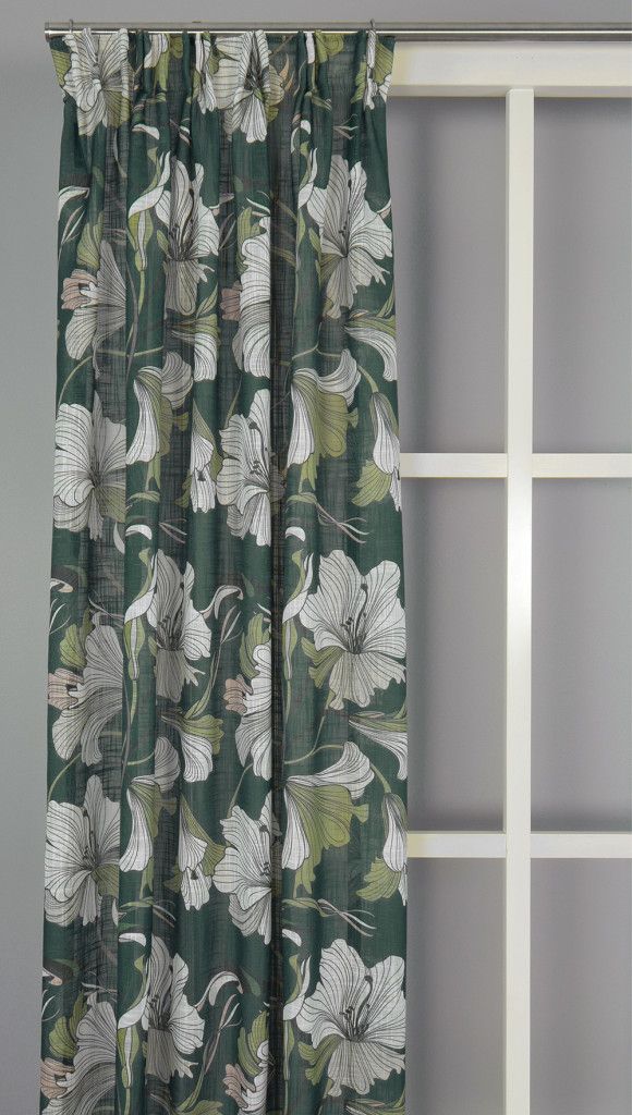 Gardiner med underbart blomstermönster i grönt, beige och vitt.