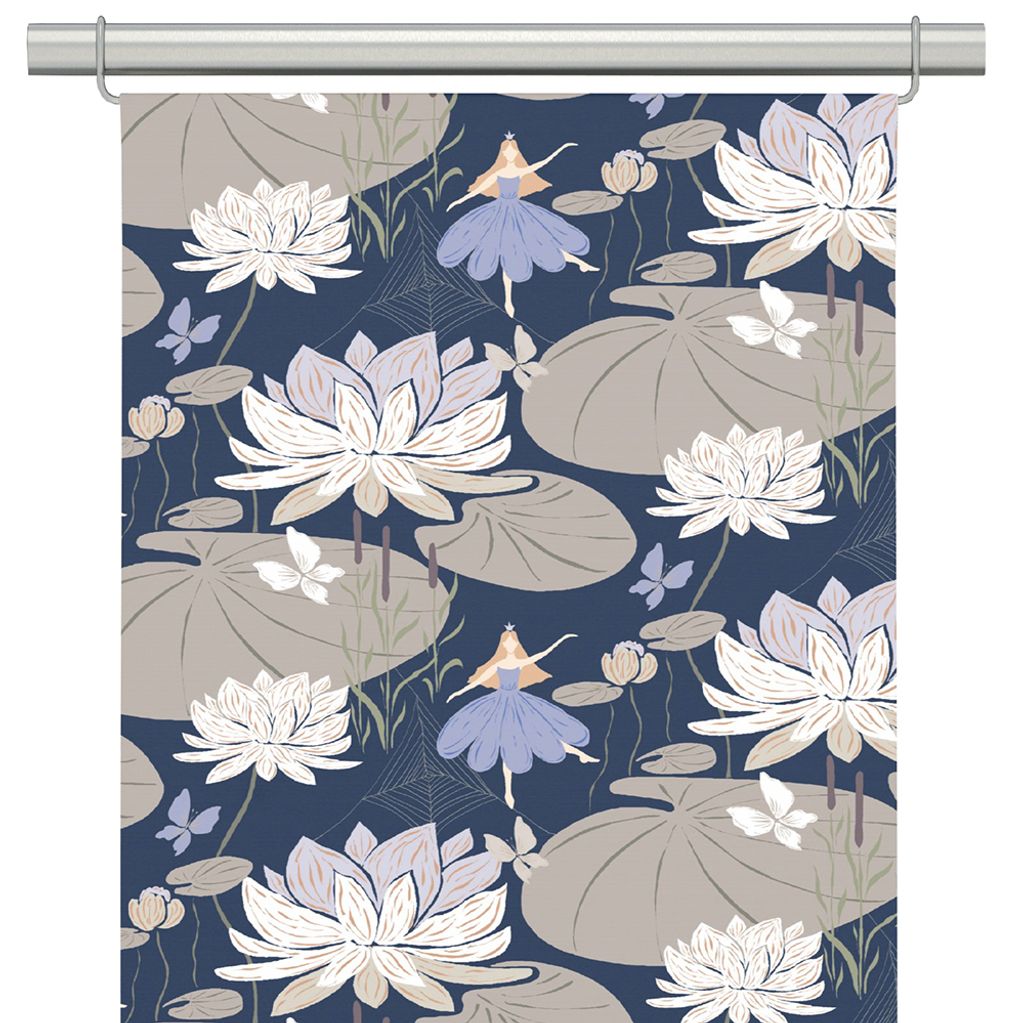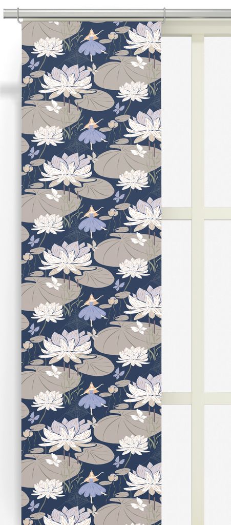 Låt dig svepas med in i en poetisk värld av magi och natur med Lily blå-beige panelgardin. Mönstret är en stiliserad skildring av ett förtrollat näckrosdike i skymningsljus. Här dansar små älvor i lavendelklänningar bland stora näckrosor, svävande fjärilar och flytande blad – allt i en harmonisk palett av dämpad blå, beige och crème.