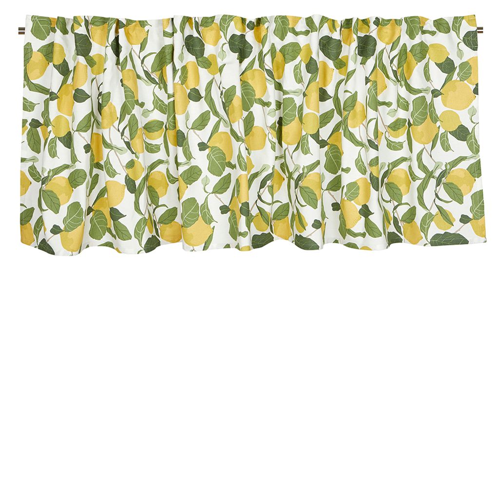 Limone gardinkappa är en härlig inreningsdetalj som för in en somrig och livfull känsla i ditt hem. Tillverkad i 100% bomull och dekorerad med ett vackert citronmönster i gult och grönt på vit bakgrund, ger den en fräsch och naturlig touch till dina fönster. Perfekt för köket, men passar lika bra i andra rum där du vill skapa en ljus och inbjudande atmosfär.