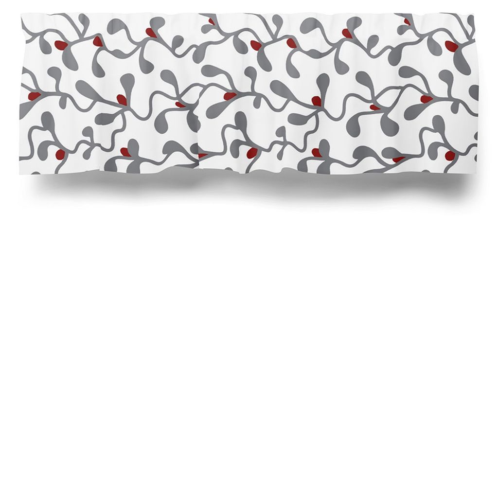 Gardinkappa med ett snirkligt mönster med vit botten och lingonris i grått och rött.