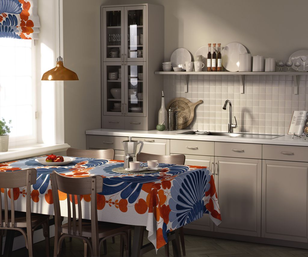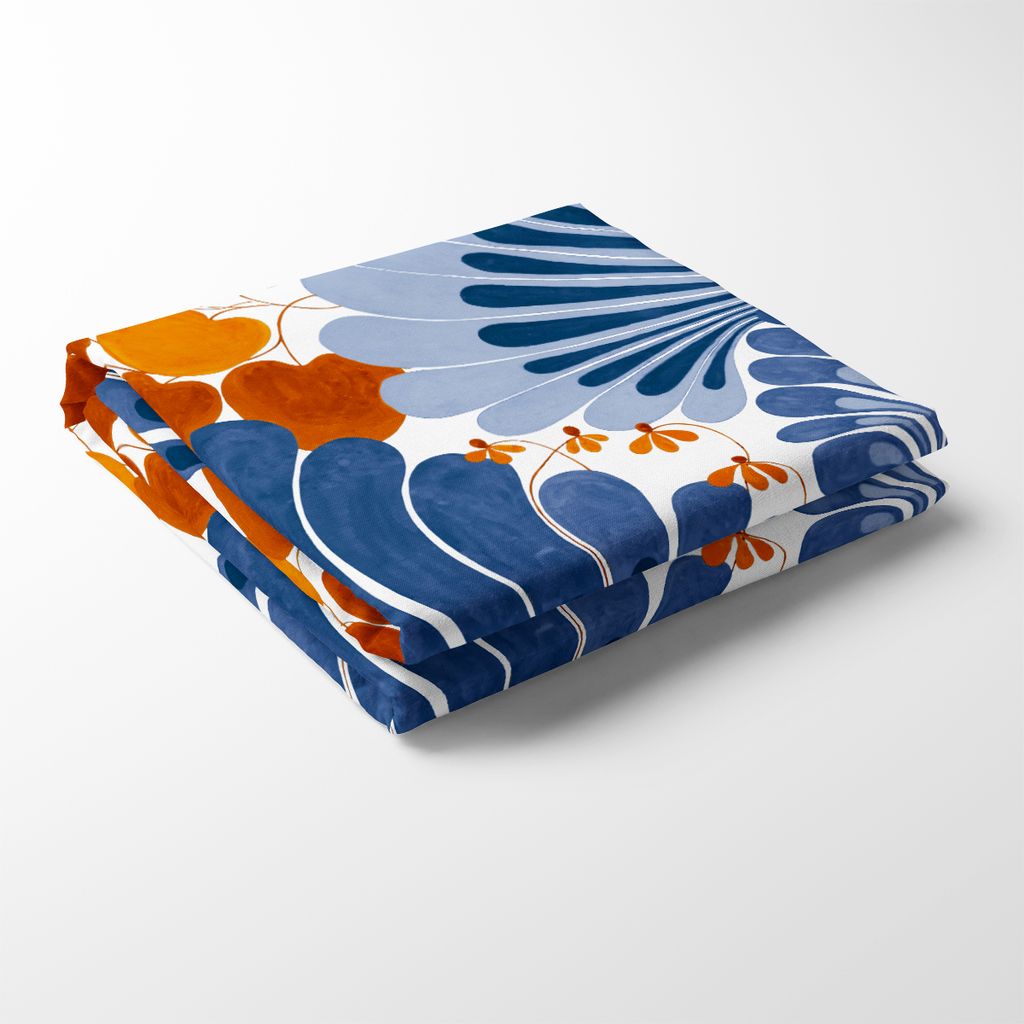 Lisette blå-orange bordsduk är en färgstark och livfull duk med ett stormönstrat blomstermotiv i djupa blå och varma orange toner. Perfekt för att skapa en inbjudande och stilfull dukning i köket eller matsalen.