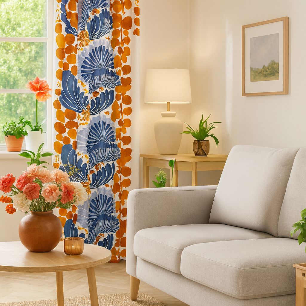 Lisette blå gardiner förvandlar ditt rum med sitt uttrycksfulla mönster i blåa och orange toner. Gardinerna ger en elegant och livfull atmosfär som passar både moderna och klassiska inredningar.