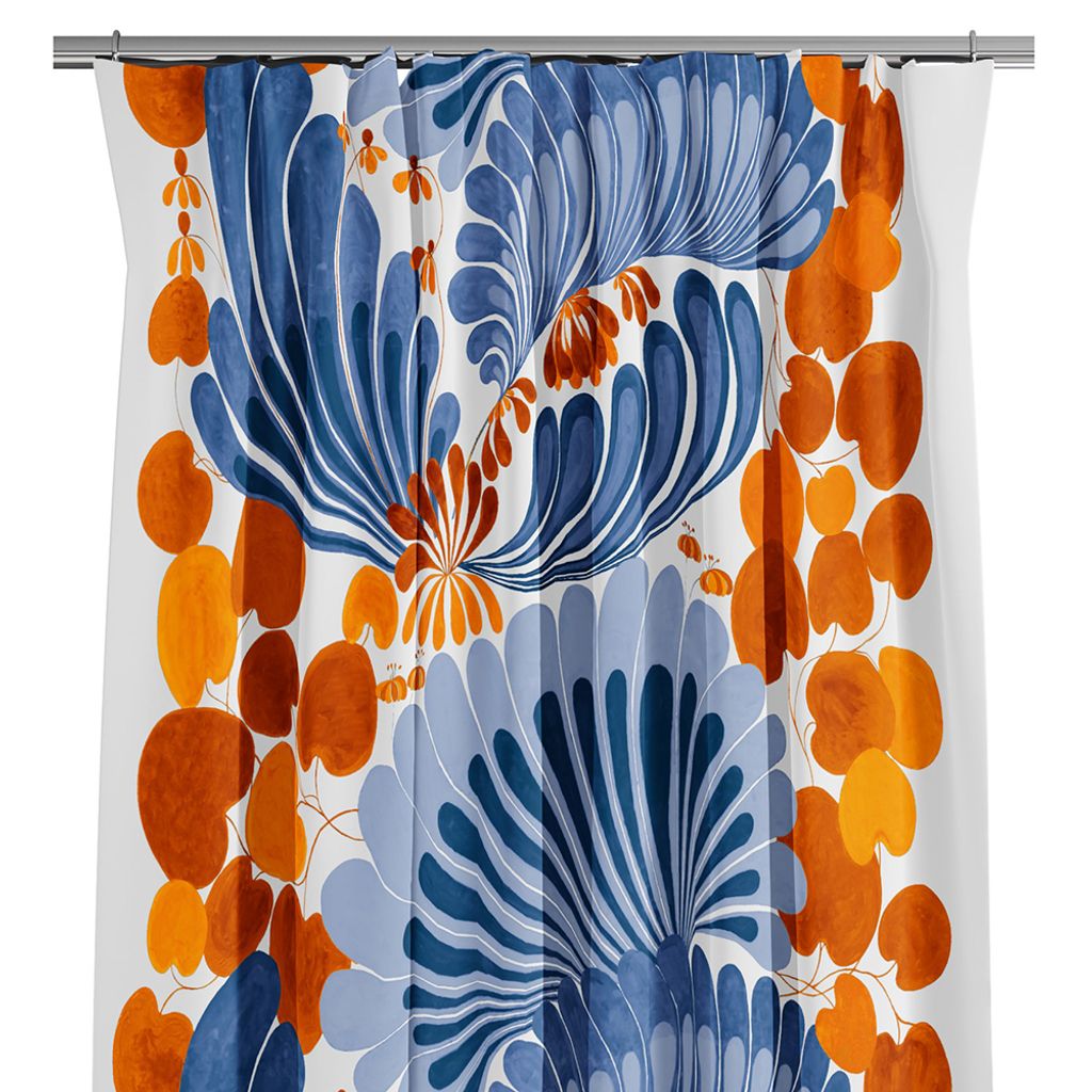 Mönstret på Lisette blå-orange gardiner har en dynamisk design med böljande bladformer och cirkulära element som påminner om undervattensvärldens flora och fauna. De intensiva blå nyanserna kontrasteras harmoniskt med klara, brända orange toner, vilket skapar en känsla av djup och energi