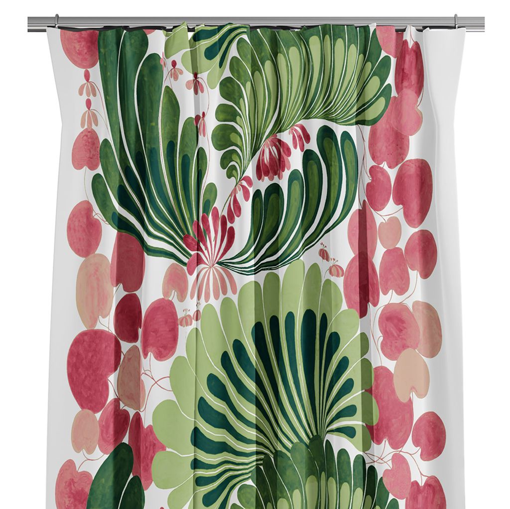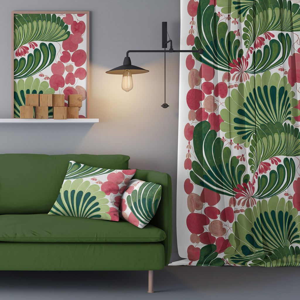 Lisette gardiner i grönt och rosa har ett unikt mönster av stiliserade blad och växtmotiv som skapar en livfull och elegant atmosfär i hemmet.