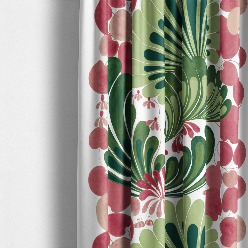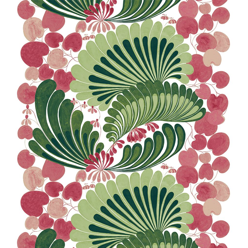 Lisette grön-rosa tyg är en härlig kombination av färg och form med sitt livfulla bladmönster i rosa och gröna nyanser. Detta bomullstyg är producerat i Spanien och passar perfekt för gardiner, kuddar och andra dekorativa projekt.