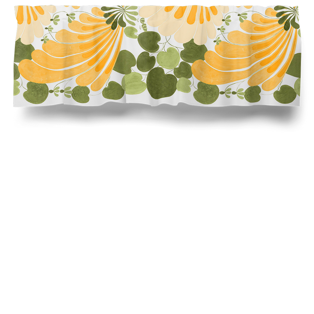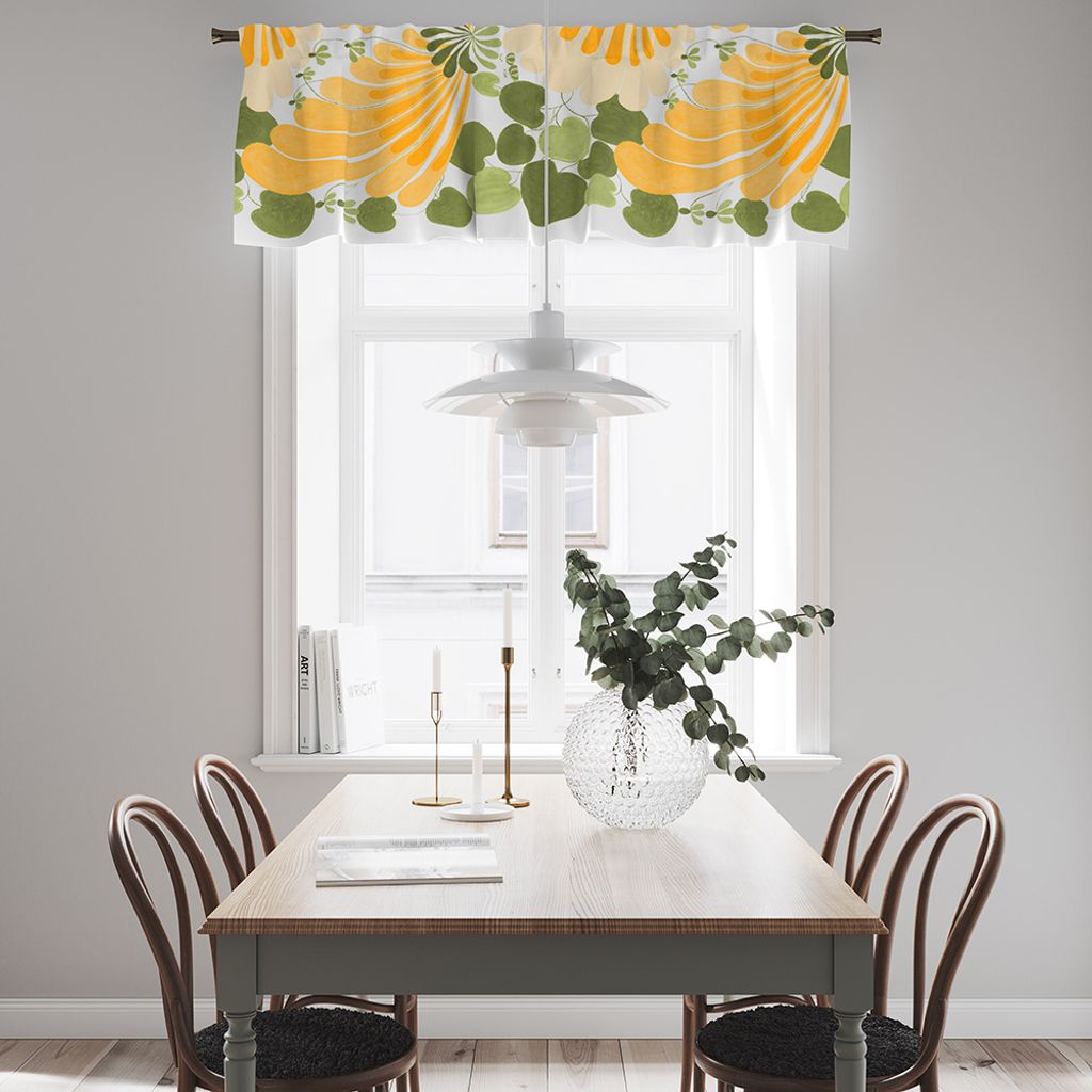 Lisette gardinkappa i gult är en lekfull och färgstark inredningsdetalj som lyser upp ditt fönster med blommig charm. Perfekt för att skapa en glad och livfull atmosfär i köket eller vardagsrummet. Kappan är 55cm hög.