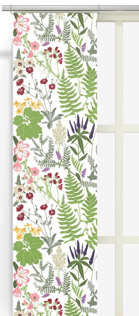 Lisstäppan är en dekorativ panelgardin tillverkad i ett mjukt och slitstarkt halvlinne. Med ett frodigt blommönster i härliga nyanser av grönt, rosa, rött och lila blir gardinen ett konstnärligt inslag i rummet, oavsett om du inreder kök, vardagsrum eller sovrum.