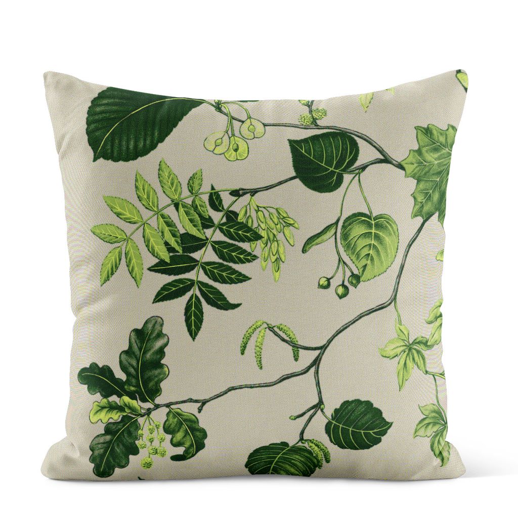 Liv beige-grön kuddfodral med ett detaljerat naturmotiv mot en linneliknande beige bakgrund. Skapar en rogivande atmosfär med vackra gröna blad och växtmotiv.