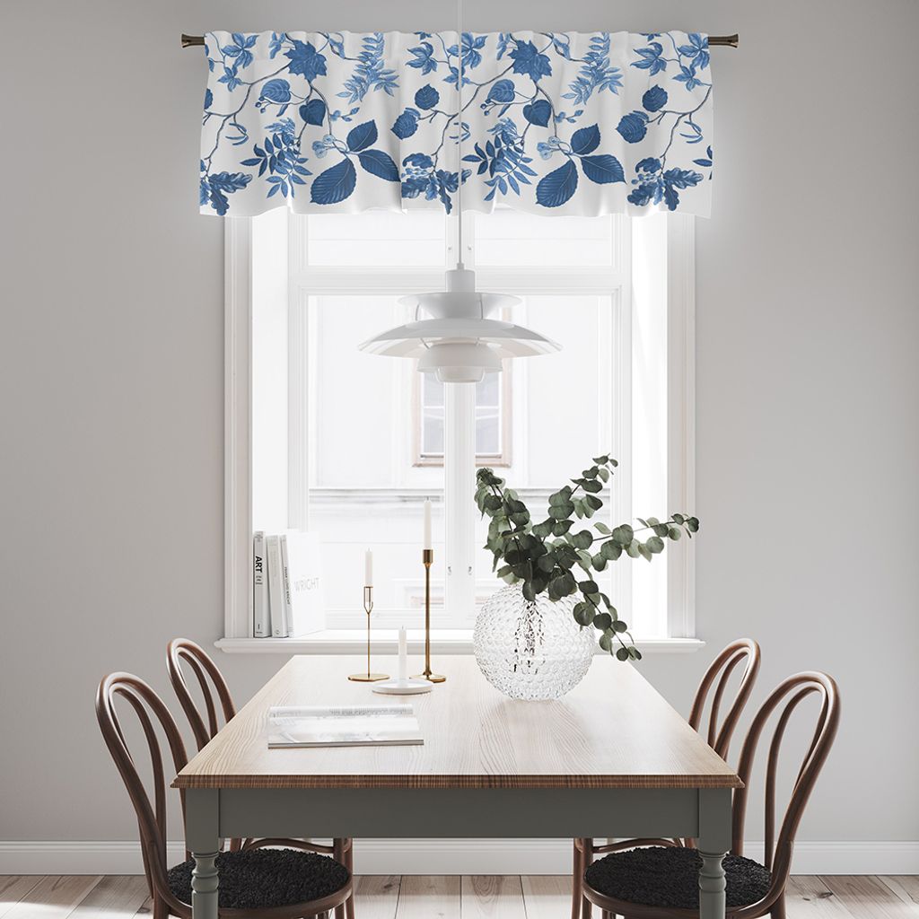 Gardinkappa med vit botten och bladslingor i blått.