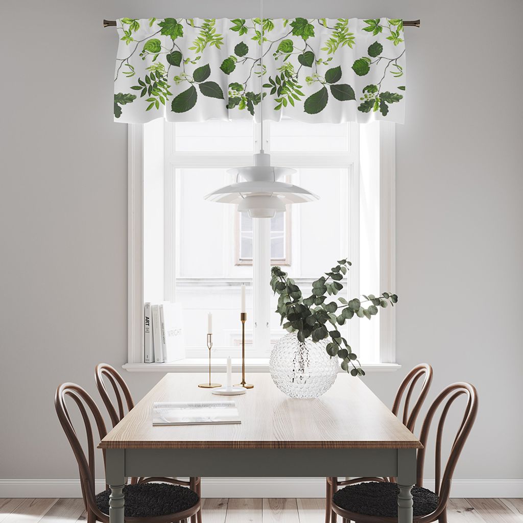 Gardinkappa med vit botten och bladslingor i grönt.
