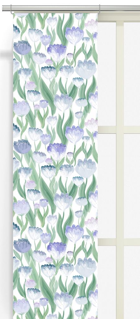 Ljuvlig blå panelgardiner är ett fint val för dig som vill skapa ett ljust och rogivande hem med ett tydligt men mjukt mönster. De handmålade blommorna i svala blå, lila och vita nyanser samspelar med de gröna bladen och ger gardinerna ett levande men balanserat uttryck.