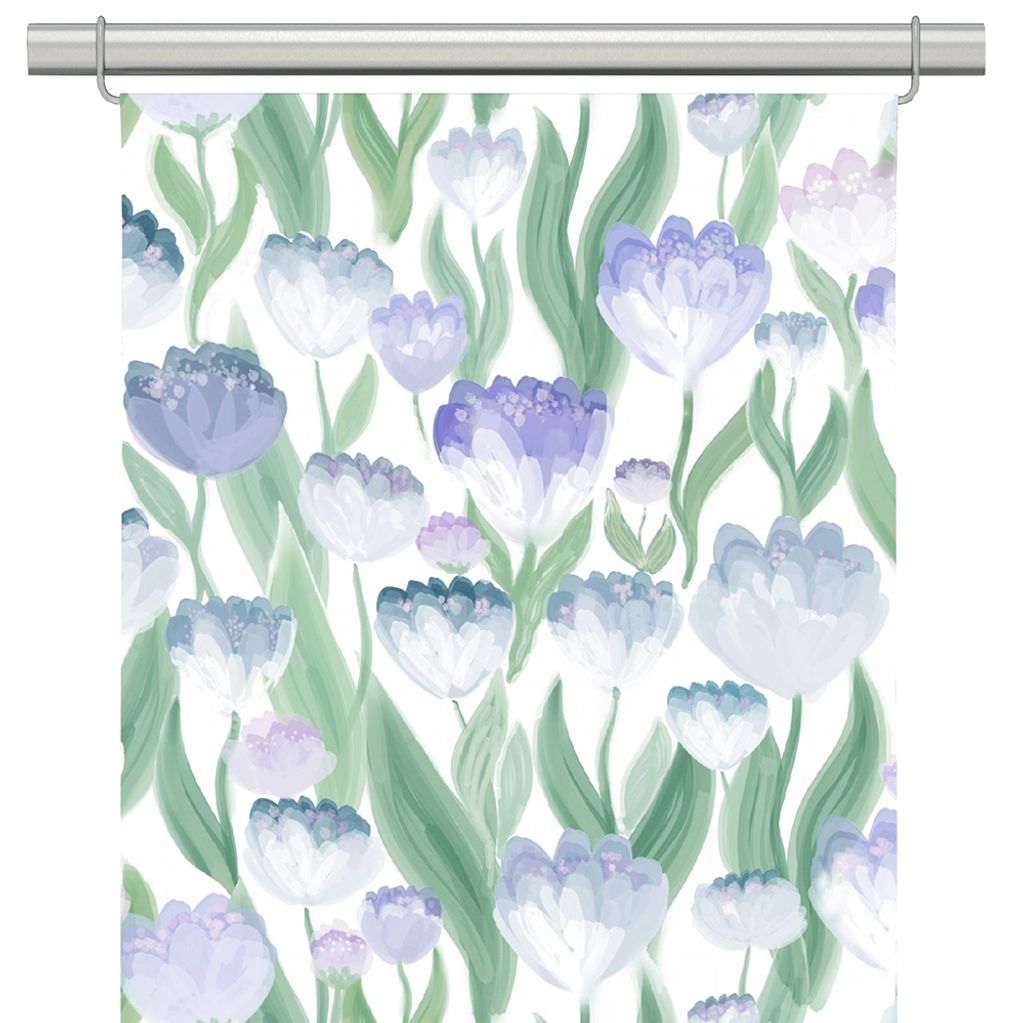 Ljuvlig blå panelgardiner har ett mjukt blomstermönster i blå och lila toner med gröna blad mot en ljus botten. Ett lätt och harmoniskt uttryck som ger rummet en lugn, ombonad känsla.