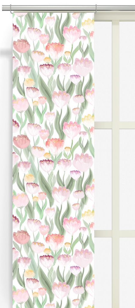 Ljuvlig rosa panelgardiner är perfekta för dig som vill addera färg på ett mjukt och inbjudande sätt. Det handmålade blomstermönstret går i dämpade rosa nyanser tillsammans med inslag av aprikos, ljusgult och grönt, vilket skapar ett levande men balanserat helhetsintryck.