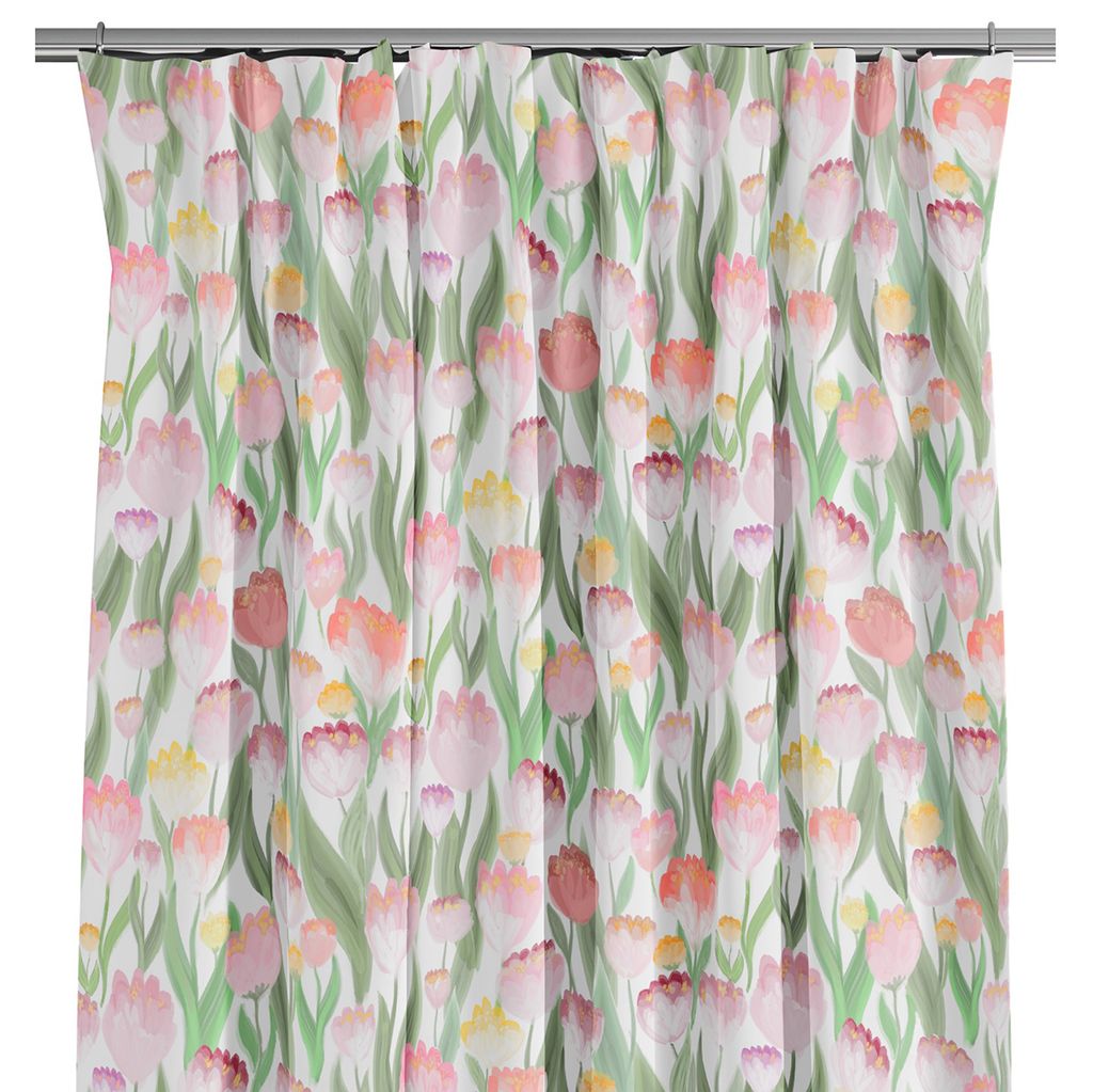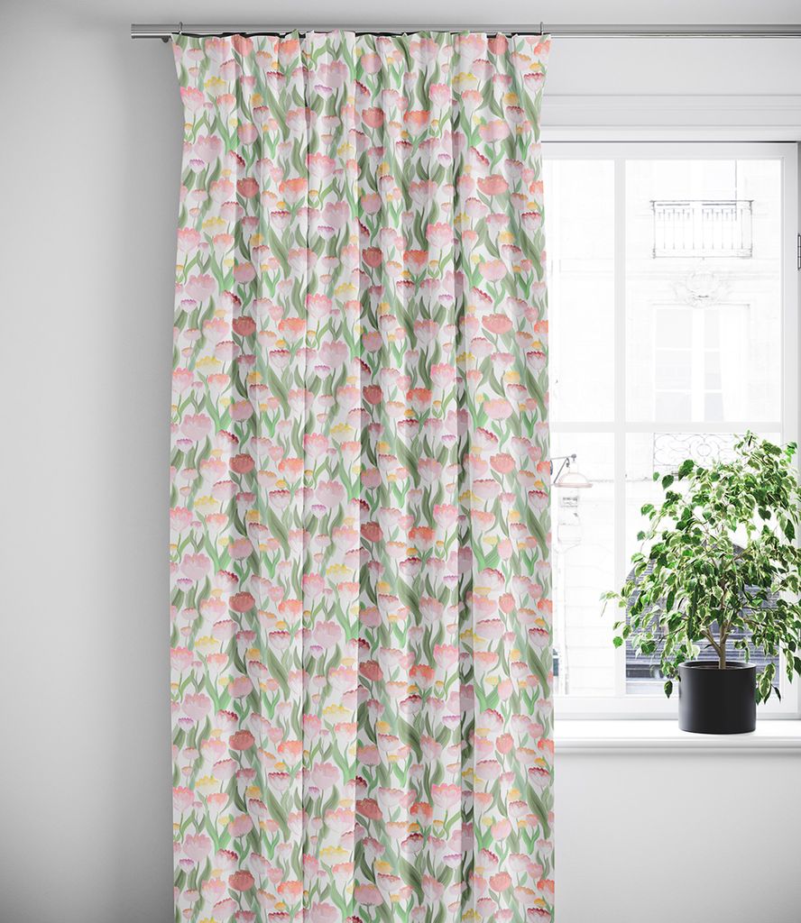 Ljuvligt rosa gardiner har ett mjukt blommönster i rosa, aprikos och gula toner med gröna blad som ger rummet en varm och harmonisk känsla. Ett ljust och levande inslag som passar många typer av rum.