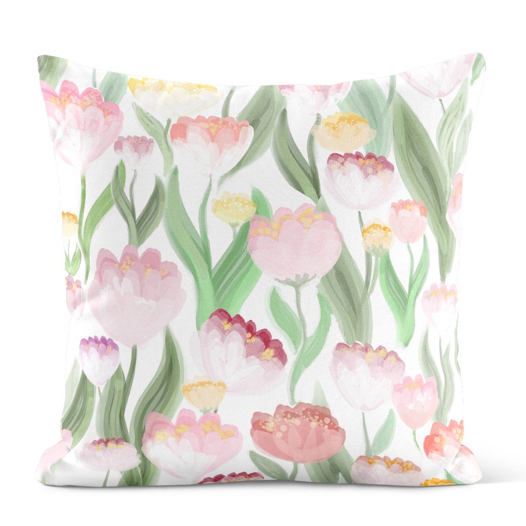 Ljuvligt rosa kuddfodral är dekorerat med ett romantiskt blomstermönster i mjuka nyanser av rosa, aprikos och gult, balanserat med gröna blad som ger mönstret liv och rörelse. Det akvarellika uttrycket skapar en luftig och behaglig helhet som känns både lugn och ombonad.