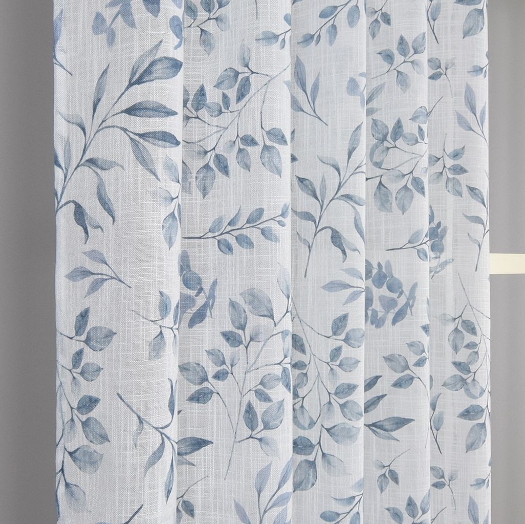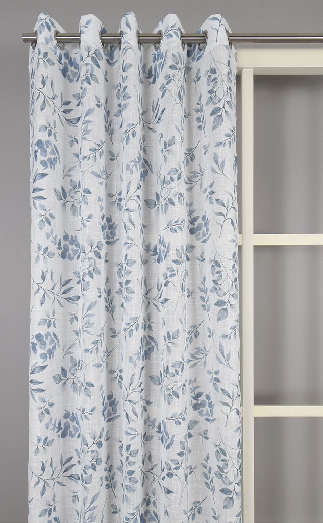 Loke Blå öljettgardiner . Med sitt stilrena lövmönster och det tunna, luftiga tyget är dessa gardiner ett perfekt val för rum där du vill ha ett mjukt ljusinsläpp och en harmonisk känsla.