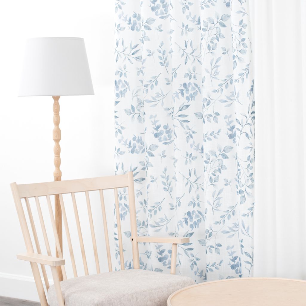 Ett par öljettgardiner med ett mjukt lövmönster i svala blå toner. Skapar en lätt och luftig känsla i rummet.