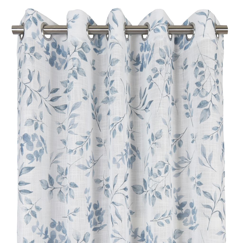 Beskrivning av Loke Blå Öljettgardiner - Lövmönster med mjukt ljusinsläpp