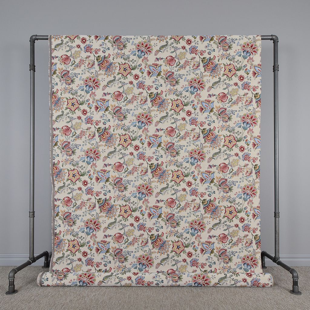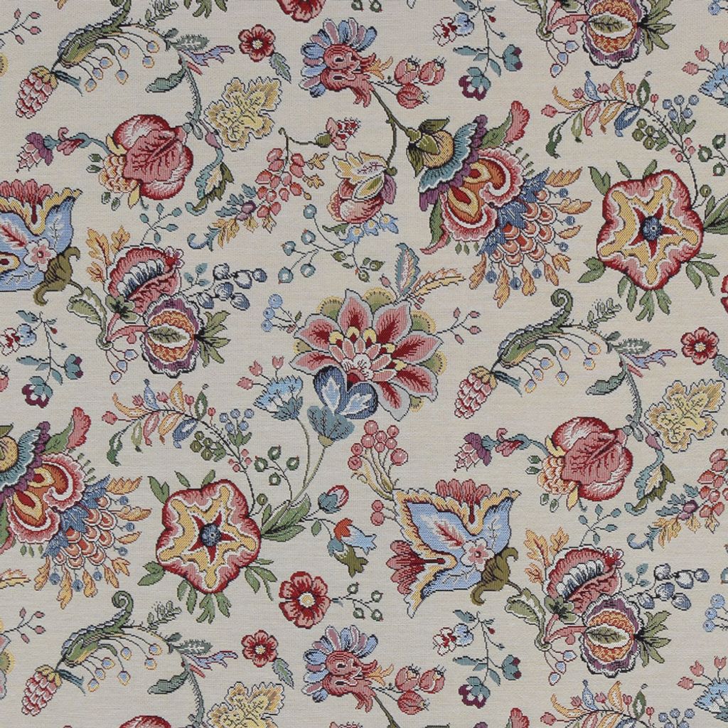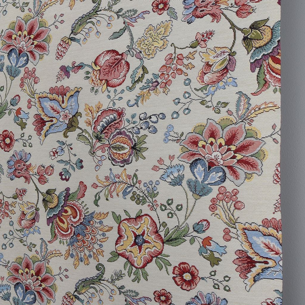 Beige botten med färgglada kurbits liknande blommor, gobeläng tyg på metervara.