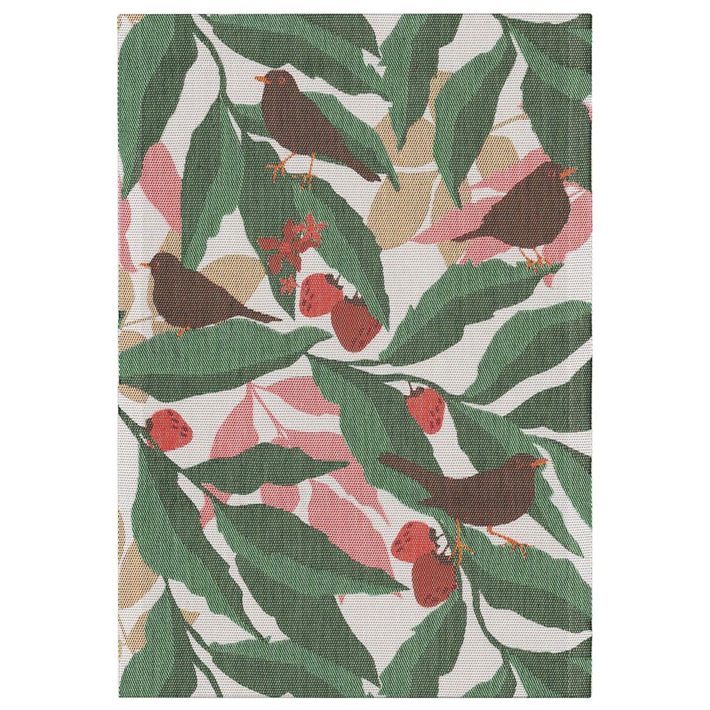 Skapa en rofylld och naturlig atmosfär i köket med Lövkvist kökshandduk. Det dekorativa mönstret kombinerar gröna bladverk med röda bär och små fåglar, vilket ger en charmig och levande design inspirerad av skandinavisk natur.