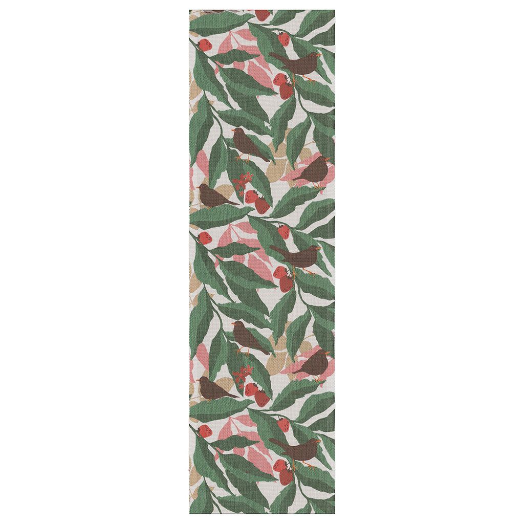 Lövkvist löpare pryds av ett harmoniskt mönster där gröna bladverk möter små fåglar och röda bär, inspirerat av naturens lugn och rörelse. Färgskalan är mjuk och balanserad, vilket gör löparen lätt att kombinera med både ljusa och mörka dukar samt andra textilier.