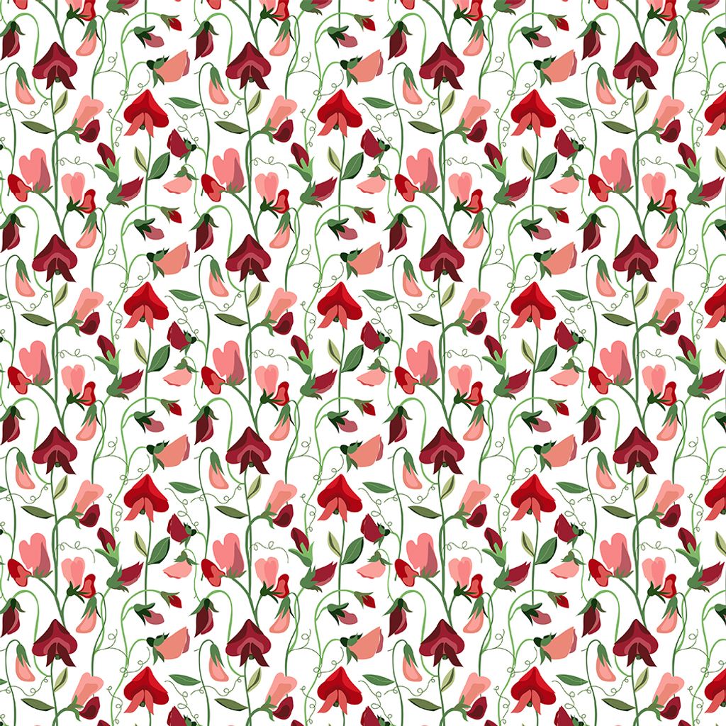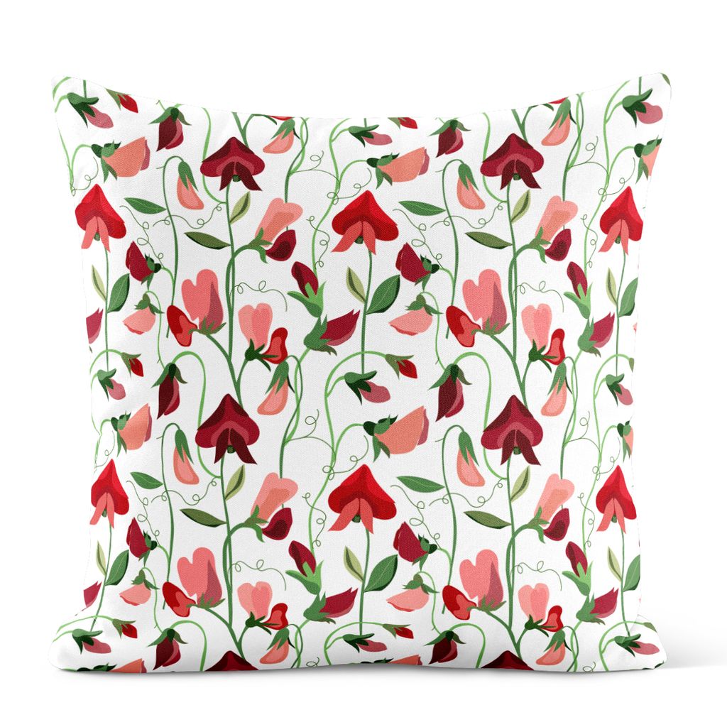 Ett livfullt kuddfodral med mönster av luktärter i röda och mjuka rosa nyanser. De slingrande stjälkarna och den ljusa bakgrunden skapar en harmonisk känsla som passar o både moderna och klassiska miljöer.