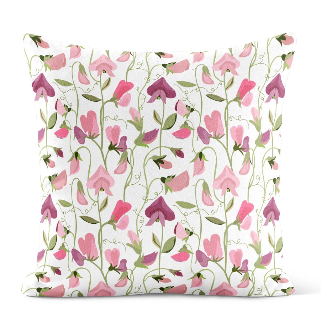Ett romantiskt kuddfodral med slingrande luktärter i mjuka rosa och gröna toner som ger en levande och harmonisk känsla till rummet.