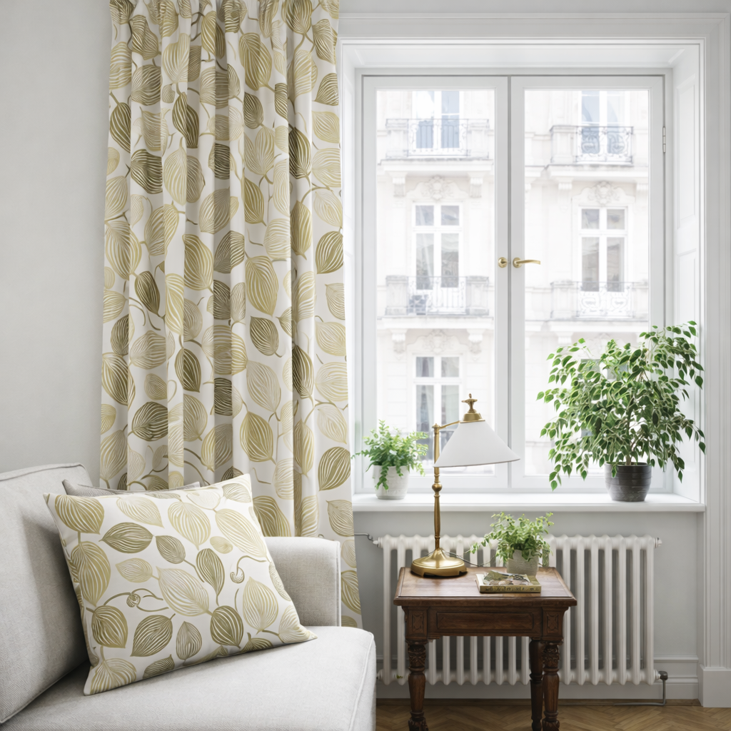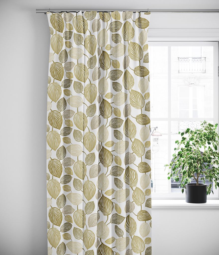 Lyckans Blad olivgrön är gardiner med ett levande bladmönster i mjuka nyanser av olivgrönt, beige och sand mot en ljus botten. Ett harmoniskt val som ger rummet ett lugnt, naturligt uttryck och släpper in ett behagligt ljus.
